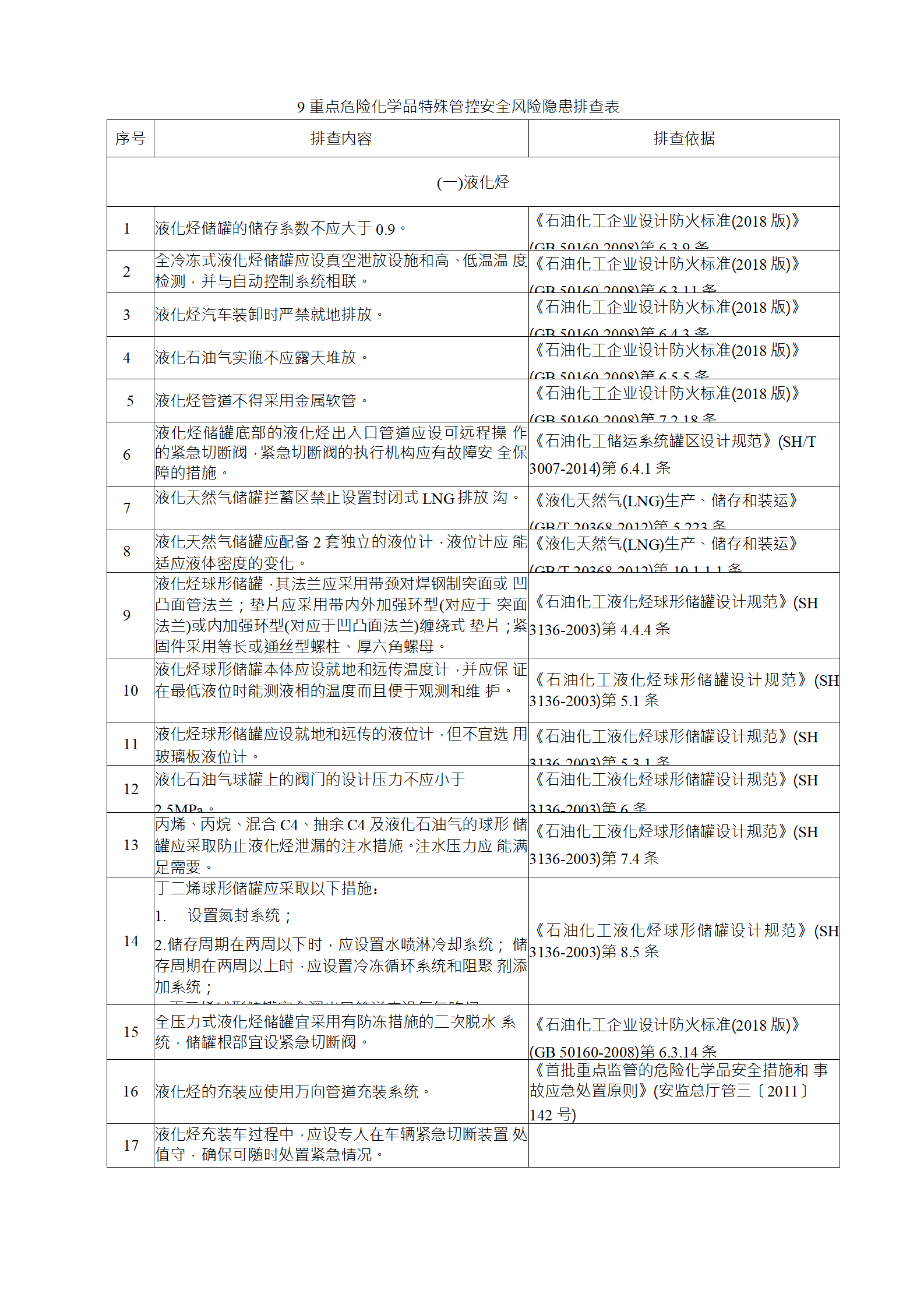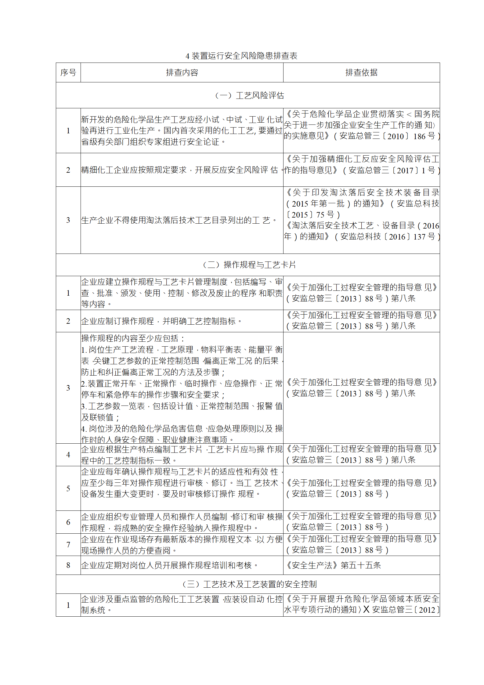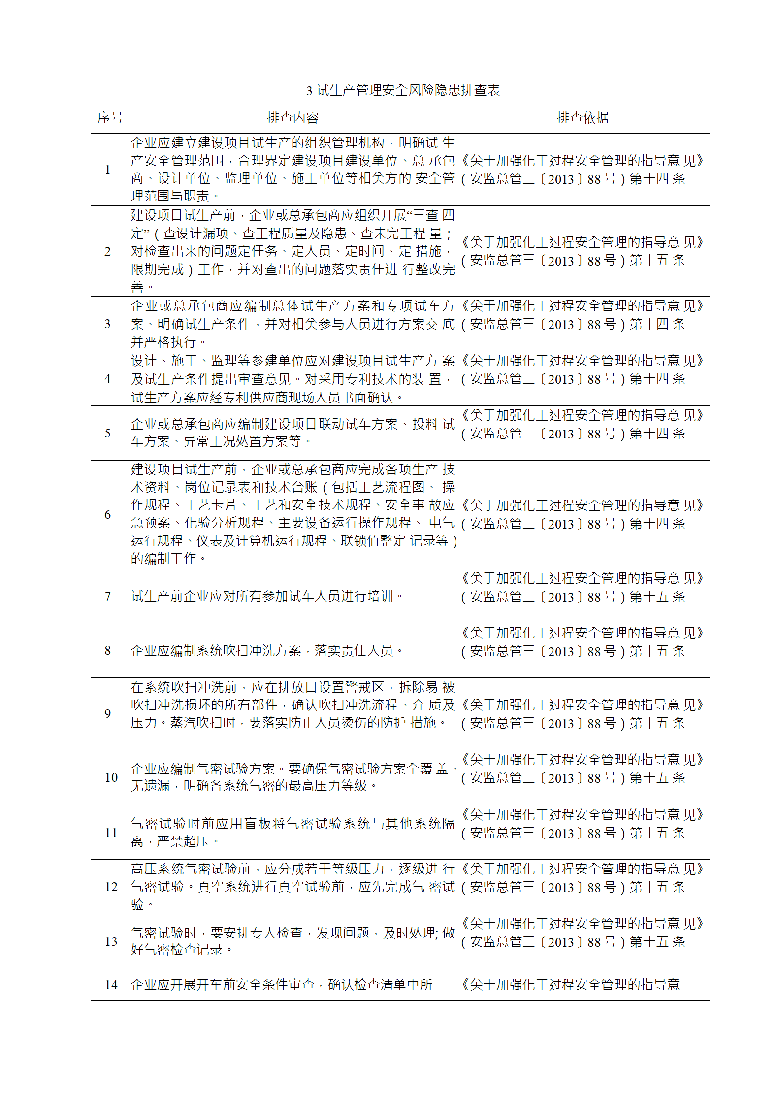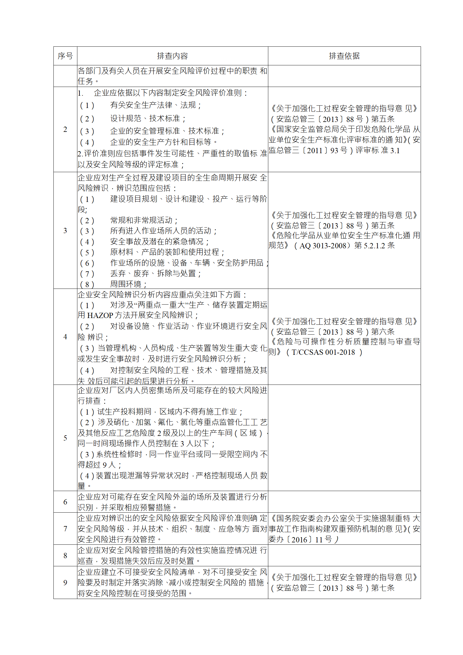 企業(yè)應(yīng)結(jié)合自身安全風(fēng)險(xiǎn)及管控水平,按照化工過程安全 管理的要求,參照各專業(yè)安全風(fēng)險(xiǎn)隱患排查表(見附件),編制 符合自身實(shí)際的安全風(fēng)險(xiǎn)隱患排查表,開展安全風(fēng)險(xiǎn)隱患排查 工作。