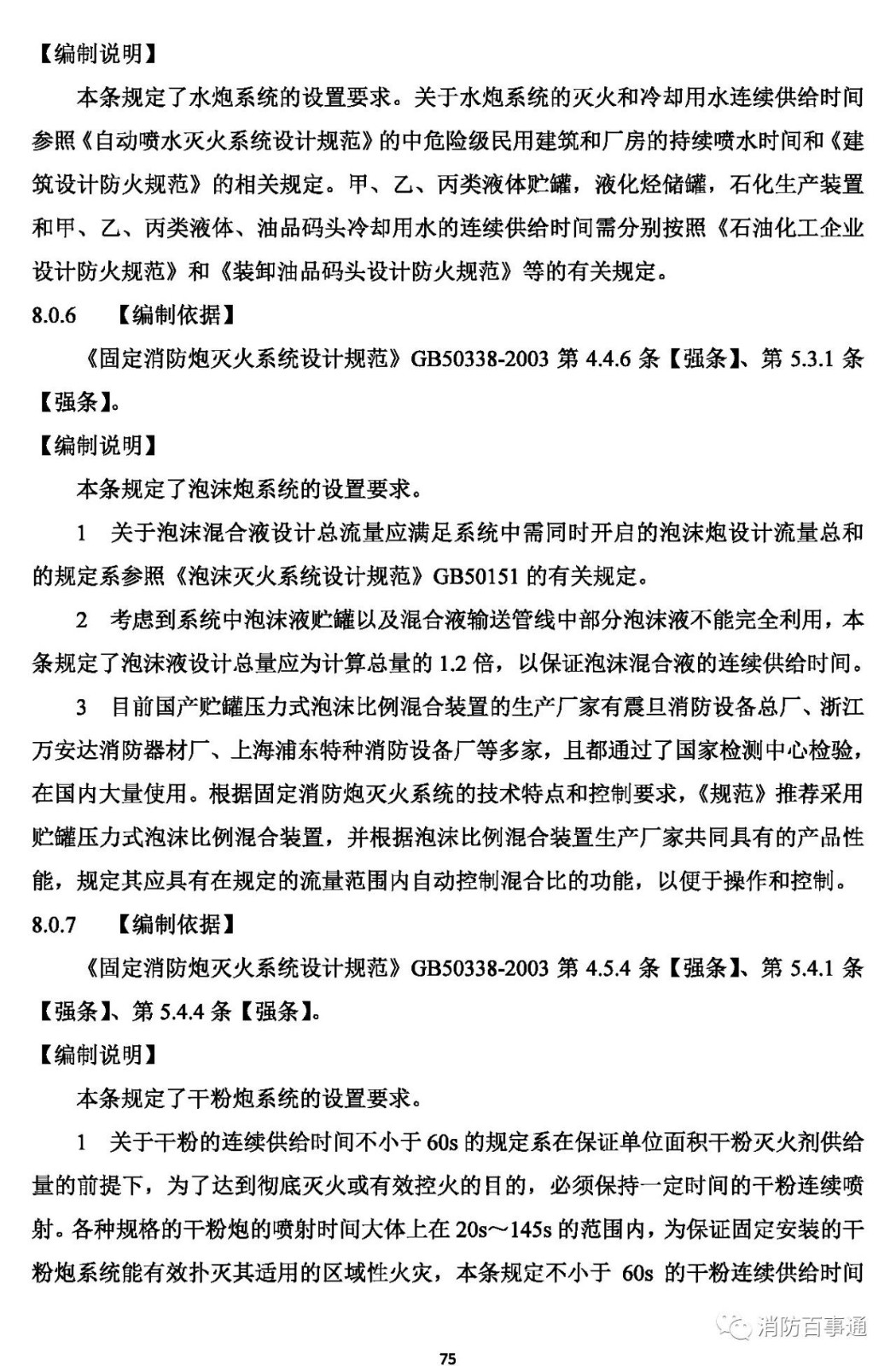 4 用于撲救非水溶性可燃液體火災(zāi)的泡沫-水噴淋系統(tǒng)、泡沫槍系統(tǒng)、泡沫炮系統(tǒng),其水成膜泡沫液在緩釋放時(shí)的抗燒時(shí)間不應(yīng)小于10min.;