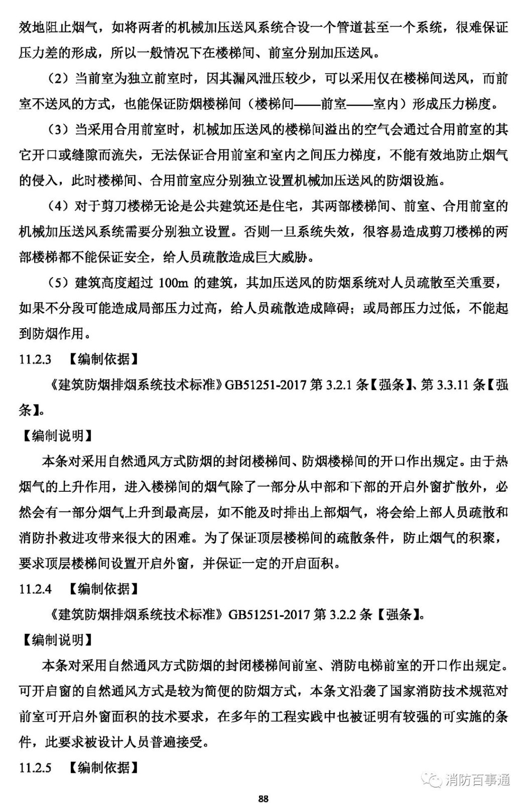 11.2.4 采用自然通風(fēng)方式防煙的防煙樓梯間前室、消防電梯前室應(yīng)具有面積不小于2.0㎡ 的可開啟外窗或開口,合用前室應(yīng)具有面積不小于3.0㎡ 的可開啟外窗或開口。