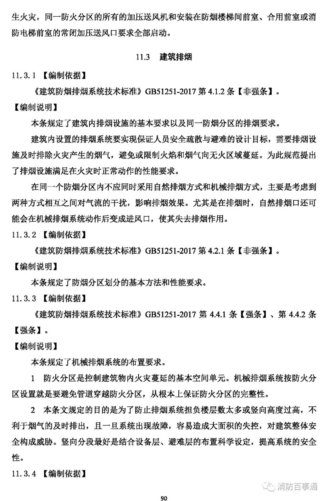 11.3.1 建筑內(nèi)設(shè)置的排煙設(shè)施應(yīng)有保證其在火災(zāi)時(shí)正常動(dòng)作的技術(shù)措施,同一個(gè)防煙分區(qū)應(yīng)采用同一種排煙方式。