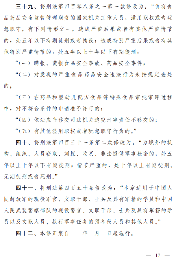 從二次審議稿內(nèi)容來看, 關(guān)于食品藥品監(jiān)管瀆職罪的規(guī)定與今年7月份的發(fā)布的草案相比 ,有了重大變化,取消了“未及時(shí)發(fā)現(xiàn)監(jiān)督管理區(qū)域內(nèi)重大食品藥品安全隱患的“的規(guī)定。草案內(nèi)容具體如下: