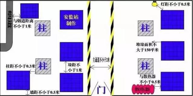 儲存物品與風管、供暖管道、散熱器的距離不應(yīng)小于0.5米。與供暖機組、風管爐、煙道之間的距離在各個方向上都不應(yīng)小于1米?!秱}儲場所消防安全管理通則》(GA1131-2014)6.14