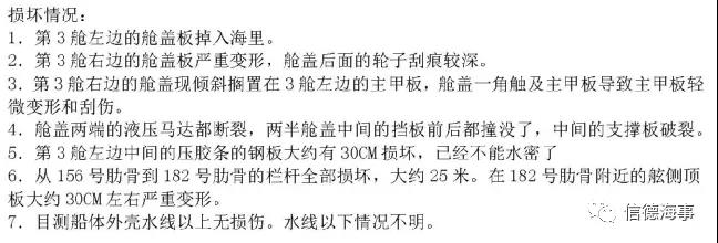 事故導(dǎo)致了百萬美金的巨大損失;幸運的是,事故發(fā)生時沒有任何人員站立在該艙左側(cè)甲板上;可以想象的是:如果當時有人站立在左側(cè),則很難幸免!