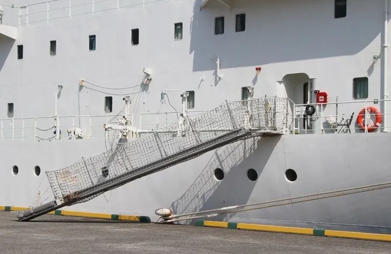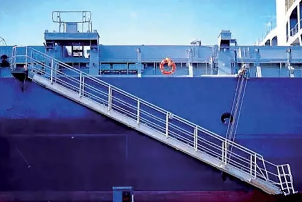 根據(jù)新生效的GB/T11701-2021《船用舷梯的基本規(guī)定》(3月1日起施行),舷梯主要分為兩類: (1)旋轉(zhuǎn)平臺式舷梯 單節(jié)舷梯、多節(jié)舷梯或伸縮舷梯的結(jié)構(gòu)與上面的旋轉(zhuǎn)平臺鉸接,可在船與登梯底面之間改變方向和傾斜角度。舷梯可用鋼絲繩或鏈從較低的(各)懸掛點(diǎn)掛住,或用固定在舷梯底部滾柱支持。 (2)固定平臺式舷梯 單節(jié)舷梯、多節(jié)舷梯或伸縮舷梯的結(jié)構(gòu)與上面的固定平臺鉸接,可在船和登梯底面之間改變傾斜角度。舷梯用鋼絲繩或鏈從較低的(各)懸掛點(diǎn)掛住,單獨(dú)使用的引航員舷梯采用此固定平臺式舷梯。 根據(jù)SOLAS第II-1章第3-9條款,凡是2010年1月1日及以后建造的船舶,必須在船上安裝經(jīng)認(rèn)可的登/離船設(shè)施,以備在港口或港口相關(guān)操作時使用。 該登/離船設(shè)施必須根據(jù)MSC.1/Circ.1331通函的要求進(jìn)行建造、測試、安裝及維護(hù),主要包括以下八點(diǎn)要求: (1)登/離船設(shè)施應(yīng)遠(yuǎn)離工作區(qū)域以及貨物或其它物體懸掛吊裝時可能通過上方的區(qū)域,該登/離船設(shè)施的目的和使用方式與引水員登 / 離船裝置是不同的; (2)應(yīng)提供足夠的照明,以照亮登/離船設(shè)施、甲板上人員登/離船和裝置控制的位置; (3)當(dāng)?shù)?離船裝置在使用時,在其附近應(yīng)備有一只帶有自亮浮燈和救生浮索的救生圈(注意這里是要求一只救生圈既配備有自亮浮燈又配備有救生浮索,并且處于隨時可用狀態(tài)); (4)每部舷梯應(yīng)具有在其最大操作傾斜角時,下平臺在最輕載水線以上不大于600mm的高度; (5)在每部舷梯或跳板梯的兩端應(yīng)設(shè)置一塊標(biāo)記牌,以清楚顯示安全操作和負(fù)荷限制,包括最大和最小允許設(shè)計傾斜角、設(shè)計負(fù)荷、最大底端板負(fù)荷等,如果最大操作負(fù)荷小于設(shè)計負(fù)荷,則最大操作負(fù)荷也應(yīng)顯示在標(biāo)記牌上; (6)跳板梯使用時安放水平傾斜角不應(yīng)大于30度和舷梯使用時水平傾斜角不應(yīng)大于55度; (7)在人員從登/離船設(shè)施或船舶與碼頭之間可能墜落的舷梯下應(yīng)安放安全網(wǎng); (8)正確設(shè)置舷梯下平臺的安全插銷。 收放前:應(yīng)對升降機(jī)械、鋼絲繩、滑車轉(zhuǎn)盤平臺支架等進(jìn)行檢查,確認(rèn)設(shè)備完好,鋼絲、卷筒、吊梁無障礙后方可作業(yè)。 收放過程中: (1)船靠離碼頭收放舷梯過程中,應(yīng)有專人指揮,作業(yè)人員默契配合。在浮動的梯子上進(jìn)行收起、安裝欄桿、護(hù)繩作業(yè)時,應(yīng)先檢查平臺支架是否已可靠支好,并使用止蕩索,上舷梯操作人員必須系好安全帶,穿好救生衣。 (2)舷梯落岸下踏板應(yīng)避開障礙物,安放平穩(wěn),嚴(yán)禁扭曲。吊梁、鏈條要注意絞高或安放妥當(dāng),以免碰頭和妨礙上下船。 (3)由于潮夕、裝卸貨、碼頭環(huán)境等因素影響,舷梯不能放置碼頭時,要注意隨時調(diào)整舷梯高度。當(dāng)舷梯下踏板離碼頭較高較遠(yuǎn)時,不允許勉強(qiáng)上下。梯口值班人員負(fù)責(zé)調(diào)整舷梯和提醒上下人員注意安全,必要時應(yīng)按規(guī)定加裝橋梯。 (4)由于漲落潮、移泊等原因需要松緊纜繩時,應(yīng)絞起舷梯,收起橋梯,或?qū)H丝春锰菘诮谷藛T上下。在無法使用舷梯時,要正確地搭設(shè)橋梯,必須綁扎牢固、裝妥扶手、掛好安全網(wǎng)后人員方可上下。禁止從船舷直接跳上碼頭,或從碼頭直接跳上船。 (5)舷梯、橋梯必須按規(guī)定張掛安全網(wǎng)。舷梯、橋梯處應(yīng)有防墜落、防滑等安全指示標(biāo)志。舷梯、橋梯的扶手、扶繩、階梯必須保持清爽、干凈、牢固,便于上下人員抓牢、踏實(shí)。 (6)禁止用舷梯吊運(yùn)物品,禁止超載。