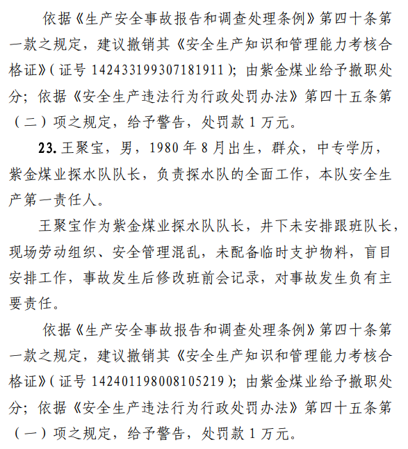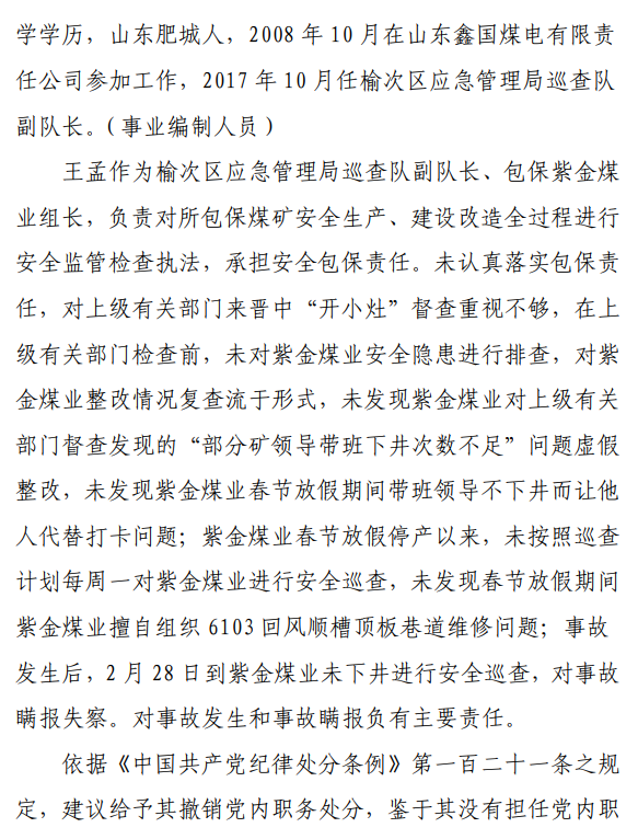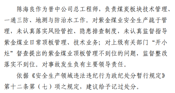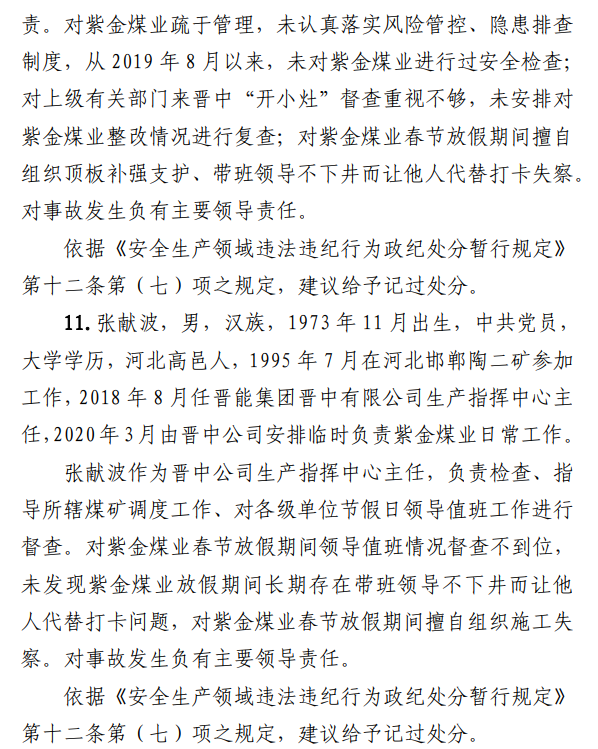 2月23日20時(shí)44分,探水隊(duì)副隊(duì)長(zhǎng)王志平通過(guò)6103回風(fēng)順槽距開口950m處的電話,向礦調(diào)度室匯報(bào)了事故情況。20時(shí)46分,調(diào)度值班人員張宏強(qiáng)向礦長(zhǎng)郭英杰匯報(bào)事故情況。郭英杰立即啟動(dòng)應(yīng)急救援預(yù)案,組織煤礦相關(guān)人員開展搶險(xiǎn)救援工作。救援人員使用單體液壓支柱、半圓木、鉸接梁對(duì)事故地點(diǎn)外圍巷道進(jìn)行臨時(shí)支護(hù),然后由外到里清渣、支護(hù),實(shí)施救援。被冒落頂板埋壓的劉永生、馬練水和王秀國(guó)于2月24日14時(shí)30分、2月25日6時(shí)30分、2月25日14時(shí)分別被救出升井。經(jīng)醫(yī)生在井口確認(rèn),3人已無(wú)生命體征,之后被送往榆次區(qū)殯儀館,搶險(xiǎn)救援工作結(jié)束。事故瞞報(bào)、謊報(bào)經(jīng)過(guò)2月24日,礦長(zhǎng)郭英杰安排信息中心主任梁煥修改人員定位系統(tǒng),關(guān)閉了工業(yè)視頻,刪除調(diào)度錄音通訊、虹膜數(shù)據(jù)。2月25日17時(shí)許,紫金煤業(yè)紀(jì)檢書記、黨總支副書記高建忠(臨時(shí)主持紫金煤業(yè)董事會(huì)及黨務(wù)日常事務(wù))和礦長(zhǎng)郭英杰組織召開煤礦管理層會(huì)議。會(huì)上郭英杰、高建忠、紫金煤業(yè)安全生產(chǎn)技術(shù)總監(jiān)南海為了瞞報(bào)事故,對(duì)偽造出入井?dāng)?shù)據(jù)、修改人員定位數(shù)據(jù)、銷毀調(diào)度電話錄音、刪除視頻監(jiān)控資料、清理井下事故現(xiàn)場(chǎng)等事項(xiàng)進(jìn)行了安排。2月24日至25日,高建忠安排生產(chǎn)副礦長(zhǎng)杜永忠、安全副礦長(zhǎng)楊雙喜等人與遇難者家屬協(xié)商辦理賠償事宜,并安排遇難者家屬配合礦方瞞報(bào)事故。3月5日,在榆次區(qū)人民政府組織的核查過(guò)程中,郭英杰、高建忠均否認(rèn)事故發(fā)生,郭英杰、高建忠、南海繼續(xù)安排煤礦有關(guān)工作人員瞞報(bào)事故。3月8日上午9時(shí)許,在榆次區(qū)人民政府已查實(shí)事故、正在擬文上報(bào)的期間,紫金煤業(yè)向山西煤銷晉中公司、榆次區(qū)應(yīng)急管理局和晉中煤監(jiān)分局電話匯報(bào)事故,稱三名巡檢人員走到事故地點(diǎn)時(shí),頂板突然冒落導(dǎo)致事故發(fā)生,謊報(bào)了事故的經(jīng)過(guò)和原因。2月23日22時(shí)左右,武全珍在井下安排王家偉完善措施內(nèi)容。王家偉出井后在措施中增加了:“頂板較完整區(qū)域補(bǔ)強(qiáng)支護(hù)期間采用單體支柱+鉸接頂梁做臨時(shí)支護(hù),頂板不平整處使用方木墊平、木楔背緊背實(shí)”,和“臨時(shí)支護(hù)安全技術(shù)措施”相關(guān)內(nèi)容。2月24日上午,武全珍安排王家偉在該措施中增加了“絞車運(yùn)輸安全技術(shù)措施”和“移動(dòng)乳化液泵使用安全技術(shù)措施”等內(nèi)容。3月8日,生產(chǎn)礦長(zhǎng)杜永忠安排探水隊(duì)隊(duì)長(zhǎng)王聚寶在班前會(huì)記錄中加上“先抽400米水”。當(dāng)天晚上,安全礦長(zhǎng)楊雙喜在在班前會(huì)記錄中加上“不準(zhǔn)進(jìn)尺,打好臨時(shí)支護(hù)再作業(yè)”等內(nèi)容。現(xiàn)場(chǎng)人員在無(wú)臨時(shí)支護(hù)的情況下違章進(jìn)行補(bǔ)強(qiáng)支護(hù)作業(yè),施工過(guò)程中頂板失穩(wěn)冒落,導(dǎo)致事故發(fā)生。1.紫金煤業(yè)對(duì)處于極限平衡狀態(tài)的6103回風(fēng)順槽頂板存在的安全隱患辨識(shí)不清、安全風(fēng)險(xiǎn)管控不力6103回風(fēng)順槽巷道埋深大、圍巖較軟,且為迎采對(duì)掘巷道,受臨近的6101工作面開采動(dòng)壓影響大,多根錨桿錨索斷裂失效,巷道變形,底板鼓起,事故地點(diǎn)附近巷道頂板已處于高應(yīng)力的極限平衡狀態(tài)。事故發(fā)生前,事故地點(diǎn)附近巷道頂板已先后發(fā)生兩次冒落。紫金煤業(yè)對(duì)6103回風(fēng)順槽頂板存在的安全隱患辨識(shí)不清、重視不夠,未切實(shí)進(jìn)行礦壓日常監(jiān)測(cè)分析,未對(duì)斷裂失效錨桿及時(shí)補(bǔ)強(qiáng)支護(hù),施工時(shí)未采取臨時(shí)支護(hù),安全風(fēng)險(xiǎn)管控不力。2.紫金煤業(yè)技術(shù)管理工作有漏洞,《6103回風(fēng)順槽補(bǔ)強(qiáng)支護(hù)施工安全技術(shù)措施》對(duì)現(xiàn)場(chǎng)作業(yè)指導(dǎo)性差紫金煤業(yè)編制的《6103回風(fēng)順槽補(bǔ)強(qiáng)支護(hù)施工安全技術(shù)措施》對(duì)巷道補(bǔ)強(qiáng)支護(hù)作業(yè)的臨時(shí)支護(hù)形式、技術(shù)參數(shù)和要求不具體,對(duì)現(xiàn)場(chǎng)作業(yè)指導(dǎo)性差。生產(chǎn)技術(shù)科科長(zhǎng)王家偉編制措施前未到6103回風(fēng)順槽實(shí)地查看頂板情況,生產(chǎn)礦長(zhǎng)杜永忠、安全礦長(zhǎng)楊雙喜、總工程師武全珍及相關(guān)部門負(fù)責(zé)人會(huì)審措施時(shí)審查把關(guān)不嚴(yán),措施僅由探水隊(duì)隊(duì)長(zhǎng)在班前會(huì)進(jìn)行宣讀,學(xué)習(xí)貫徹不到位。3.6103回風(fēng)順槽補(bǔ)強(qiáng)支護(hù)作業(yè)勞動(dòng)組織混亂,現(xiàn)場(chǎng)安全監(jiān)管缺位事故當(dāng)班,在探水隊(duì)隊(duì)長(zhǎng)提出本隊(duì)人員不熟悉支護(hù)作業(yè)的情況下,礦領(lǐng)導(dǎo)違章指揮,仍然抽調(diào)安監(jiān)科和探水隊(duì)人員進(jìn)行支護(hù)作業(yè)。作業(