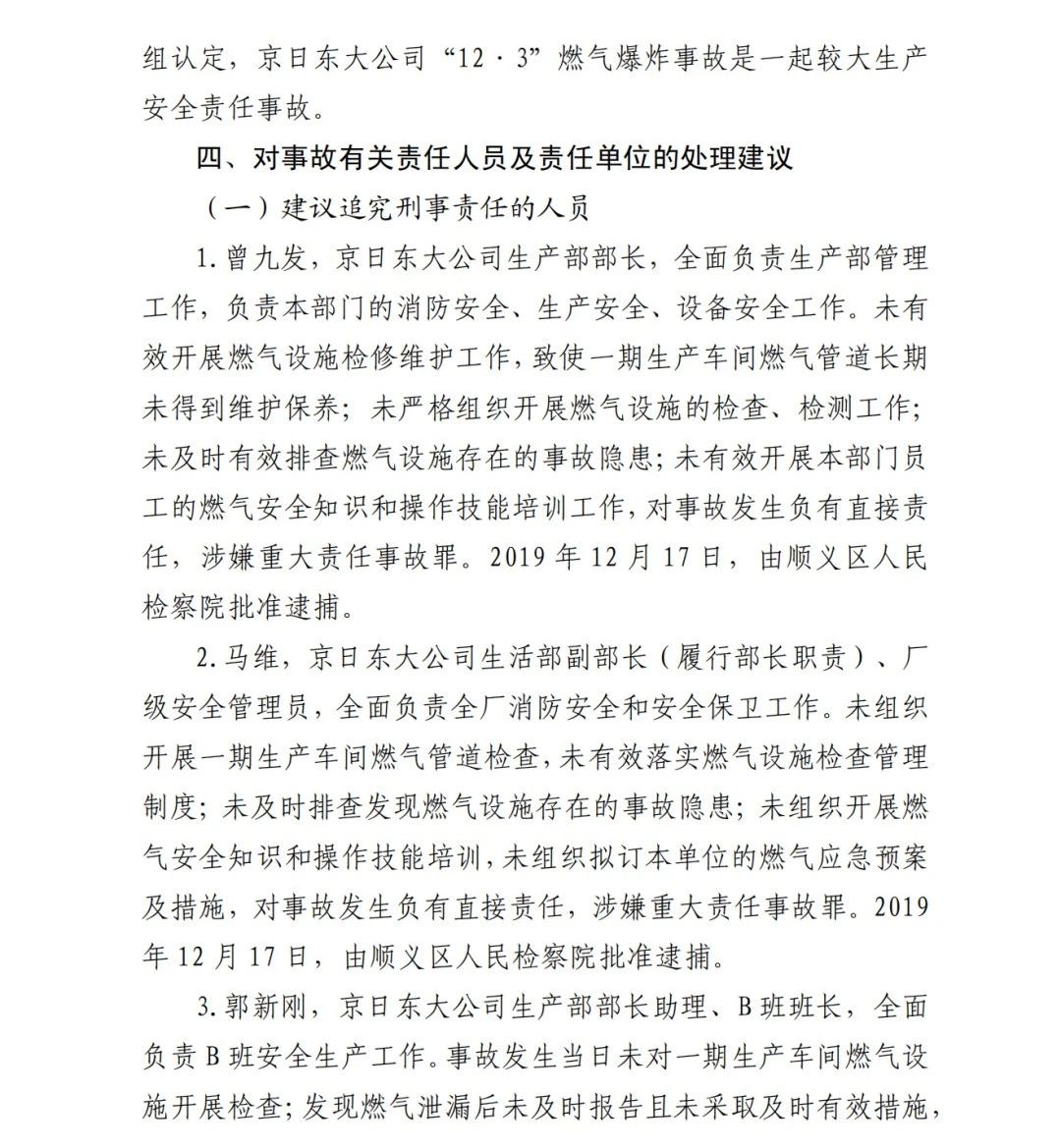 3.郭新剛,京日東大公司生產(chǎn)部部長助理、B 班班長,全面負責 B 班安全生產(chǎn)工作。事故發(fā)生當日未對一期生產(chǎn)車間燃氣設(shè)施開展檢查;發(fā)現(xiàn)燃氣泄漏后未及時報告且未采取及時有效措施,14對事故發(fā)生負有直接責任,涉嫌重大責任事故罪。2019 年 12 月 17 日,由順義區(qū)人民檢察院批準逮捕。