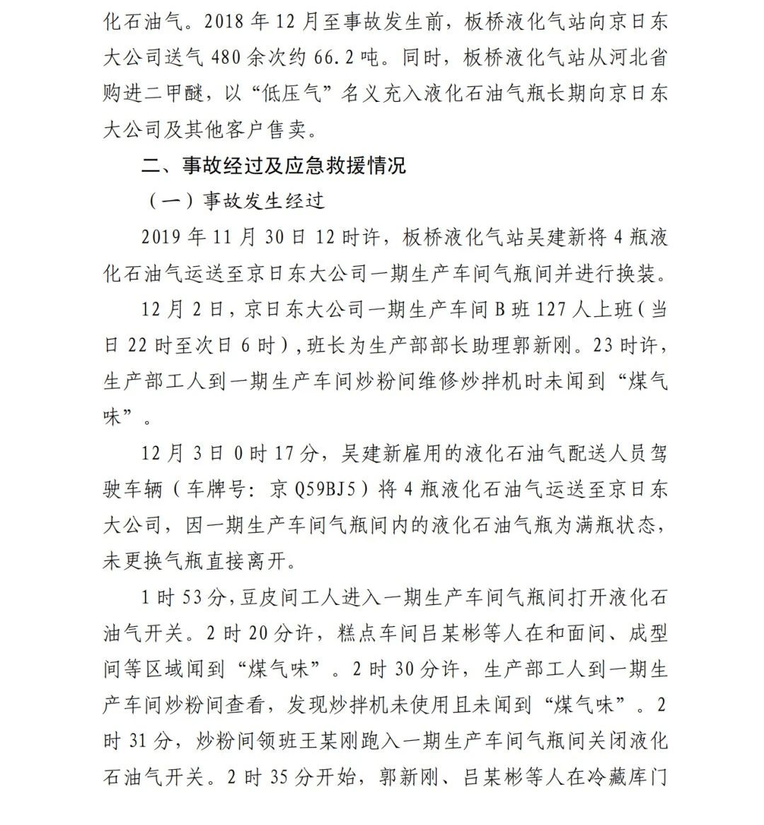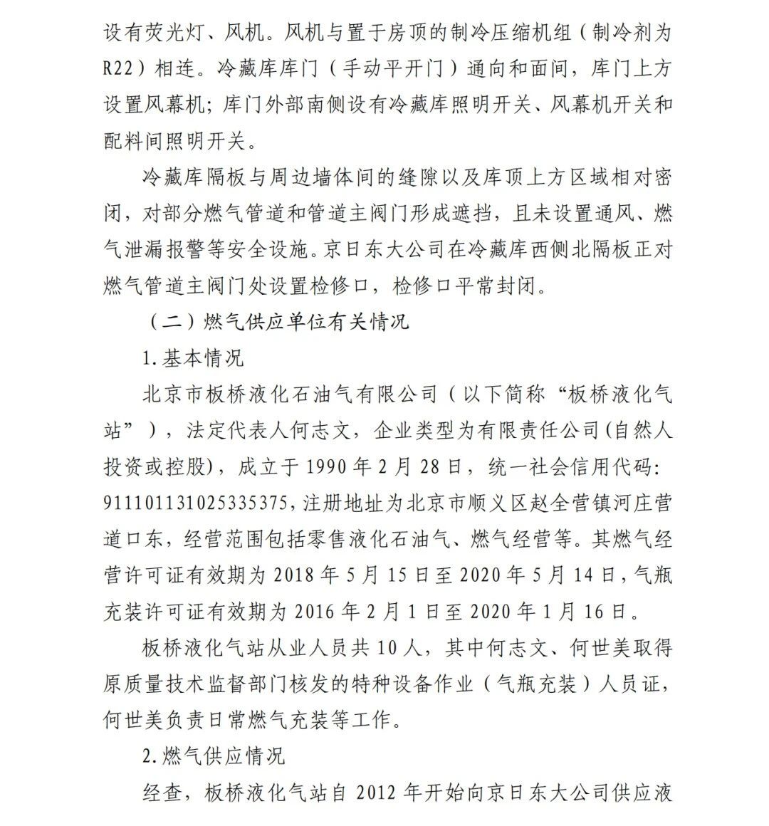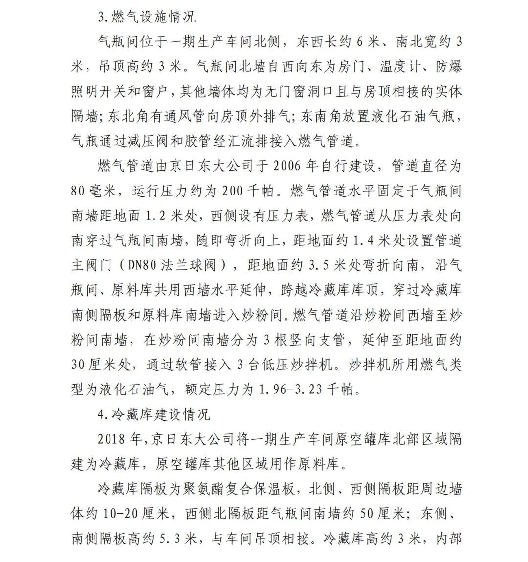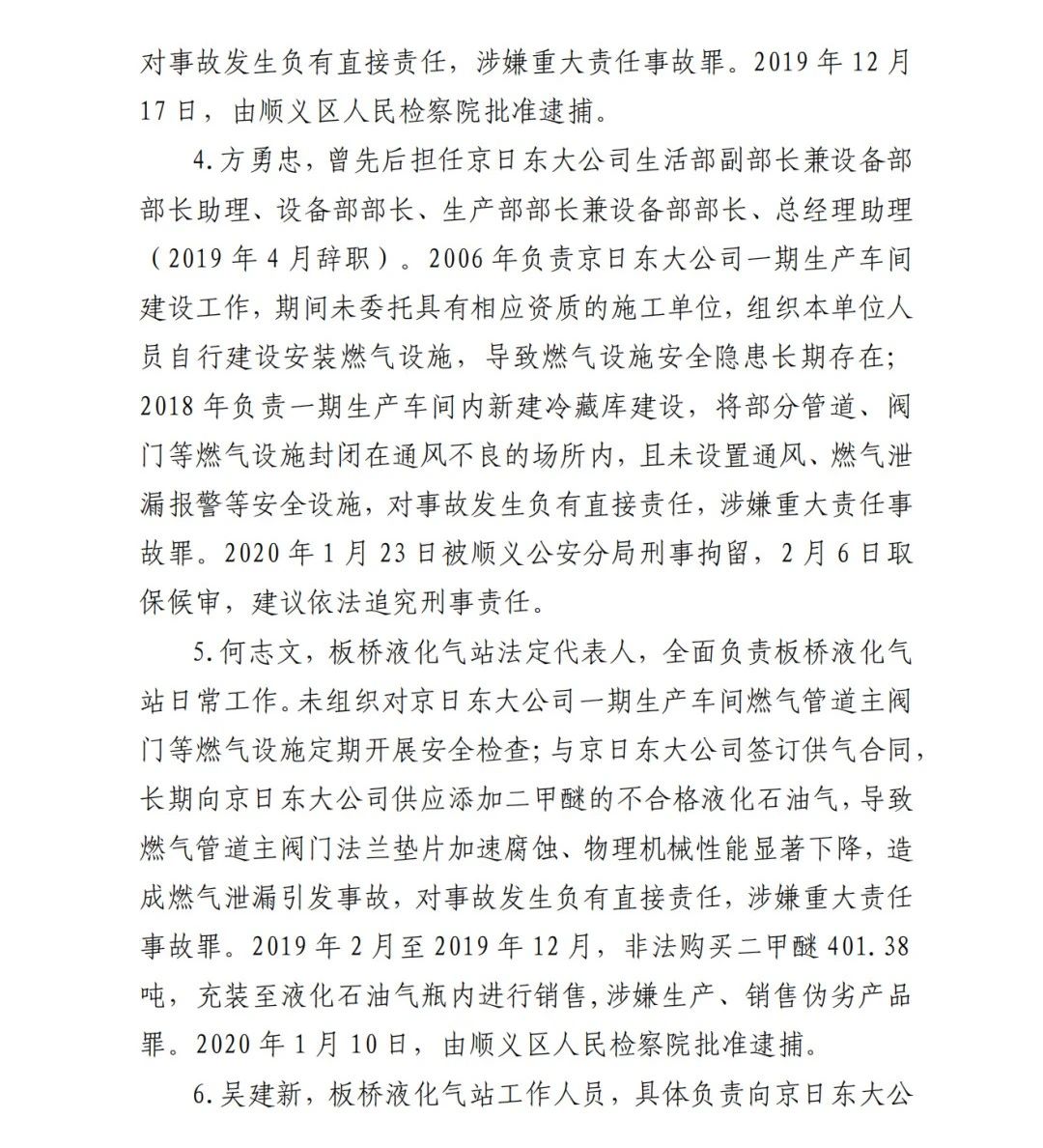 4.方勇忠,曾先后擔任京日東大公司生活部副部長兼設(shè)備部部長助理、設(shè)備部部長、生產(chǎn)部部長兼設(shè)備部部長、總經(jīng)理助理(2019年4月辭職)。2006年負責京日東大公司一期生產(chǎn)車間建設(shè)工作,期間未委托具有相應(yīng)資質(zhì)的施工單位,組織本單位人員自行建設(shè)安裝燃氣設(shè)施,導(dǎo)致燃氣設(shè)施安全隱患長期存在;2018 年負責一期生產(chǎn)車間內(nèi)新建冷藏庫建設(shè),將部分管道、閥門等燃氣設(shè)施封閉在通風不良的場所內(nèi),且未設(shè)置通風、燃氣泄漏報警等安全設(shè)施,對事故發(fā)生負有直接責任,涉嫌重大責任事 故罪。2020 年 1 月 23 日被順義公安分局刑事拘留,2 月 6 日取 保候?qū)?,建議依法追究刑事責任。