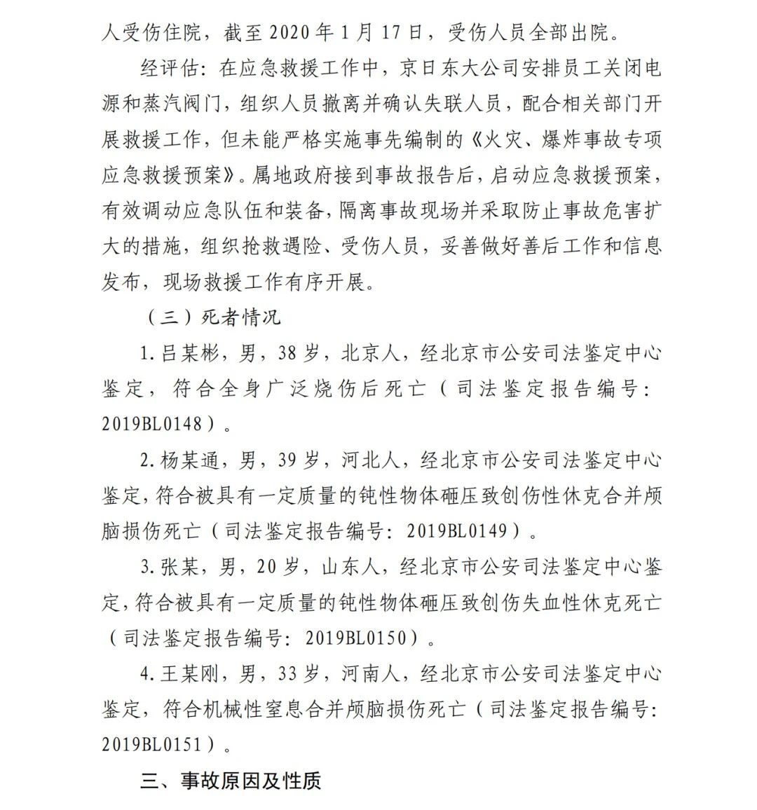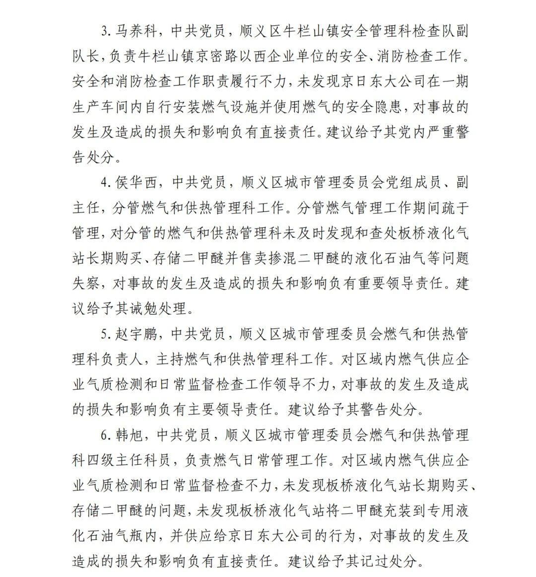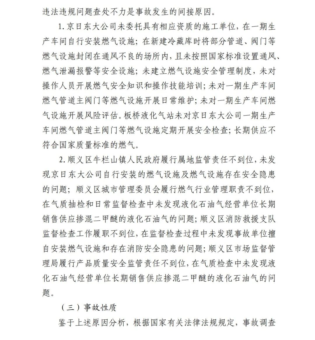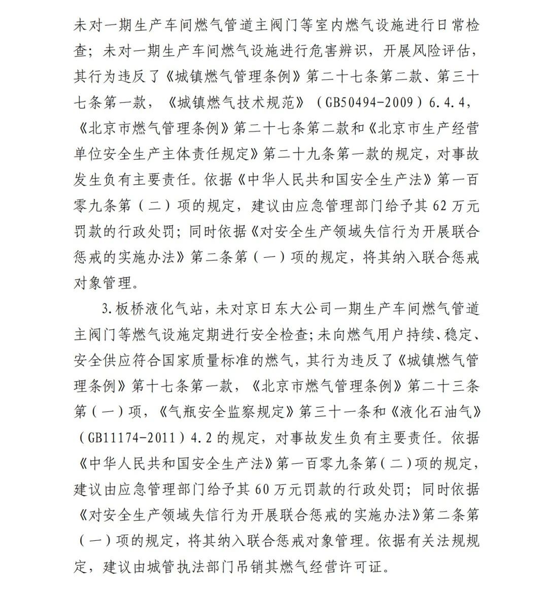 4.方勇忠,曾先后擔任京日東大公司生活部副部長兼設(shè)備部部長助理、設(shè)備部部長、生產(chǎn)部部長兼設(shè)備部部長、總經(jīng)理助理(2019年4月辭職)。2006年負責京日東大公司一期生產(chǎn)車間建設(shè)工作,期間未委托具有相應(yīng)資質(zhì)的施工單位,組織本單位人員自行建設(shè)安裝燃氣設(shè)施,導(dǎo)致燃氣設(shè)施安全隱患長期存在;2018 年負責一期生產(chǎn)車間內(nèi)新建冷藏庫建設(shè),將部分管道、閥門等燃氣設(shè)施封閉在通風不良的場所內(nèi),且未設(shè)置通風、燃氣泄漏報警等安全設(shè)施,對事故發(fā)生負有直接責任,涉嫌重大責任事 故罪。2020 年 1 月 23 日被順義公安分局刑事拘留,2 月 6 日取 保候?qū)?,建議依法追究刑事責任。