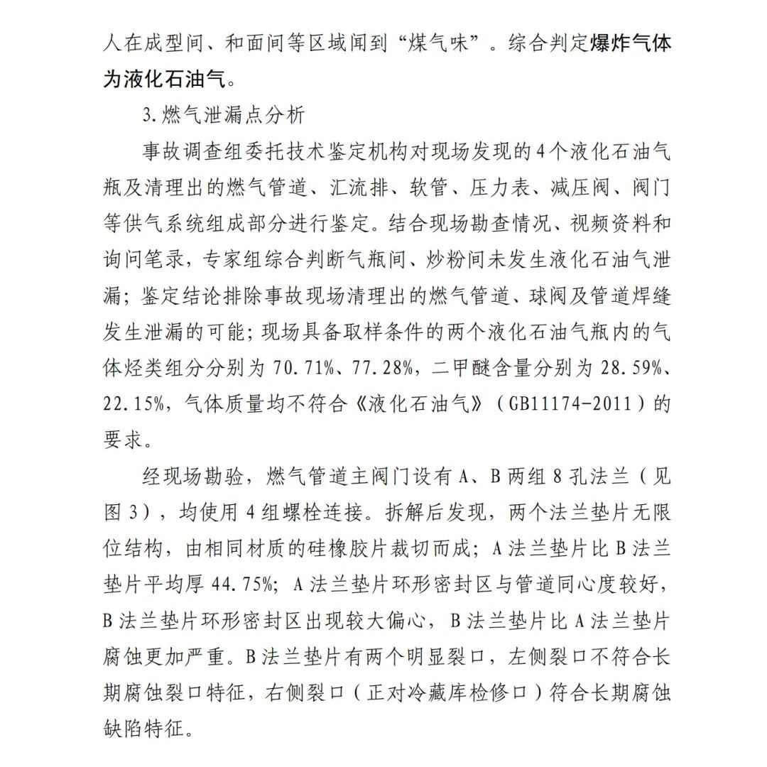本次事故的直接原因為:京日東大公司一期生產(chǎn)車間燃氣管道主閥門A、B法蘭墊片為甲基乙烯基硅橡膠材質(zhì),受管道內(nèi)液化石油氣和二甲醚混合氣體長期腐蝕,墊片物理機械性能下降,發(fā)育出微小裂隙并逐漸增長,局部發(fā)生破損脫落;在管道內(nèi)部壓力作用下,B墊片發(fā)生撕裂并形成泄漏口,泄漏出的氣體與空氣混合,在冷藏庫內(nèi)外空間形成爆炸性混合氣體,遇電氣火花等點火源發(fā)生爆炸,并引燃現(xiàn)場可燃物,導(dǎo)致事故發(fā)生。
