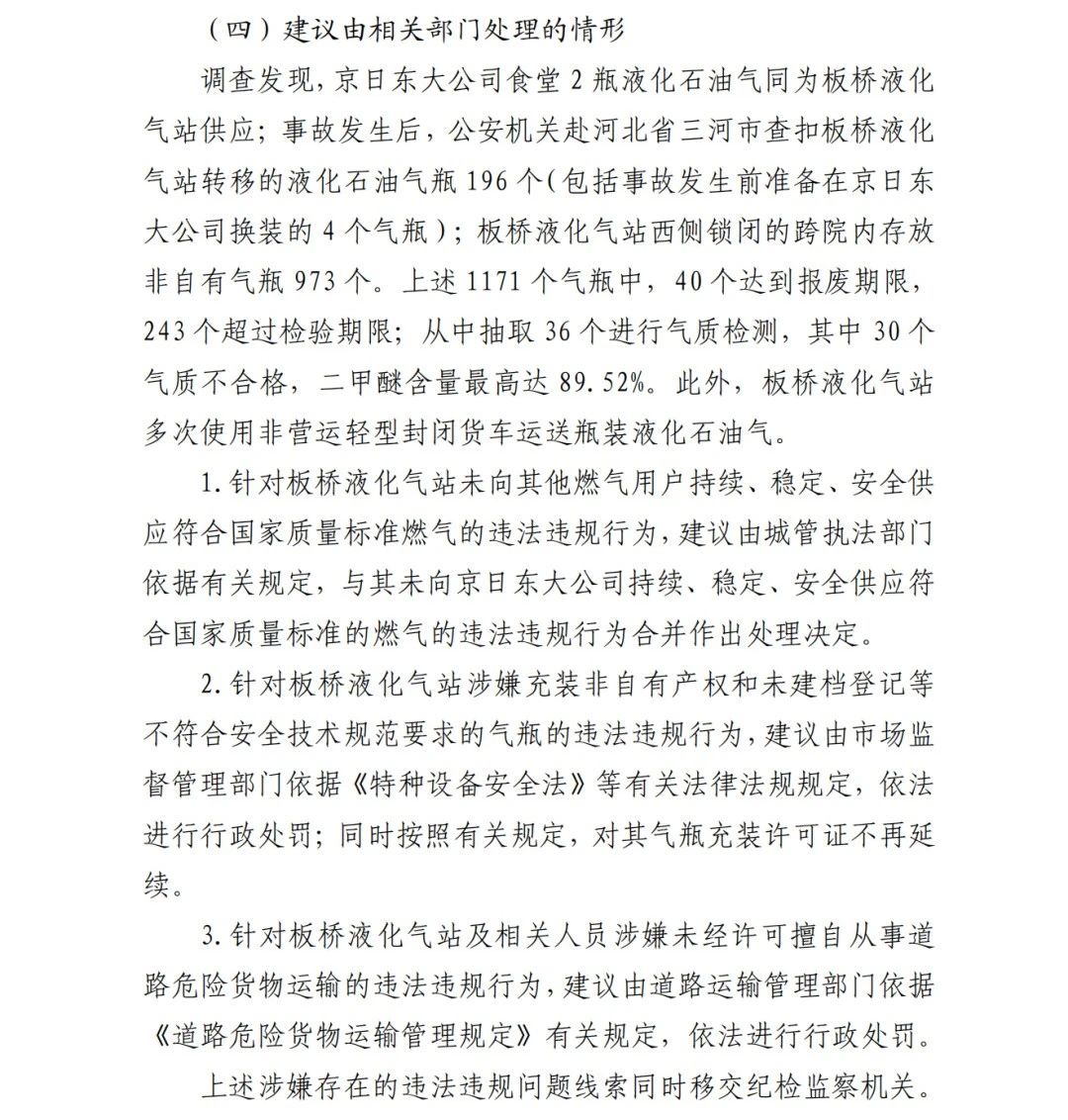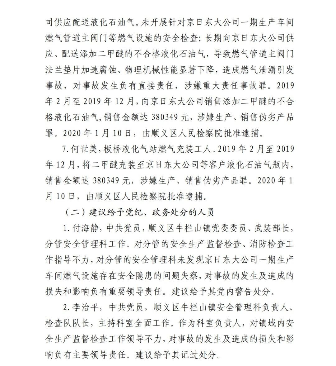 5.何志文,板橋液化氣站法定代表人,全面負責板橋液化氣站日常工作。未組織對京日東大公司一期生產(chǎn)車間燃氣管道主閥門等燃氣設(shè)施定期開展安全檢查;與京日東大公司簽訂供氣合同,長期向京日東大公司供應(yīng)添加二甲醚的不合格液化石油氣,導(dǎo)致燃氣管道主閥門法蘭墊片加速腐蝕、物理機械性能顯著下降,造 成燃氣泄漏引發(fā)事故,對事故發(fā)生負有直接責任,涉嫌重大責任事故罪。2019 年 2 月至 2019 年 12 月,非法購買二甲醚 401.38 噸,充裝至液化石油氣瓶內(nèi)進行銷售,涉嫌生產(chǎn)、銷售偽劣產(chǎn)品 罪。2020 年 1 月 10 日,由順義區(qū)人民檢察院批準逮捕。