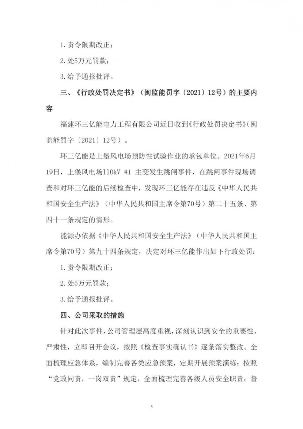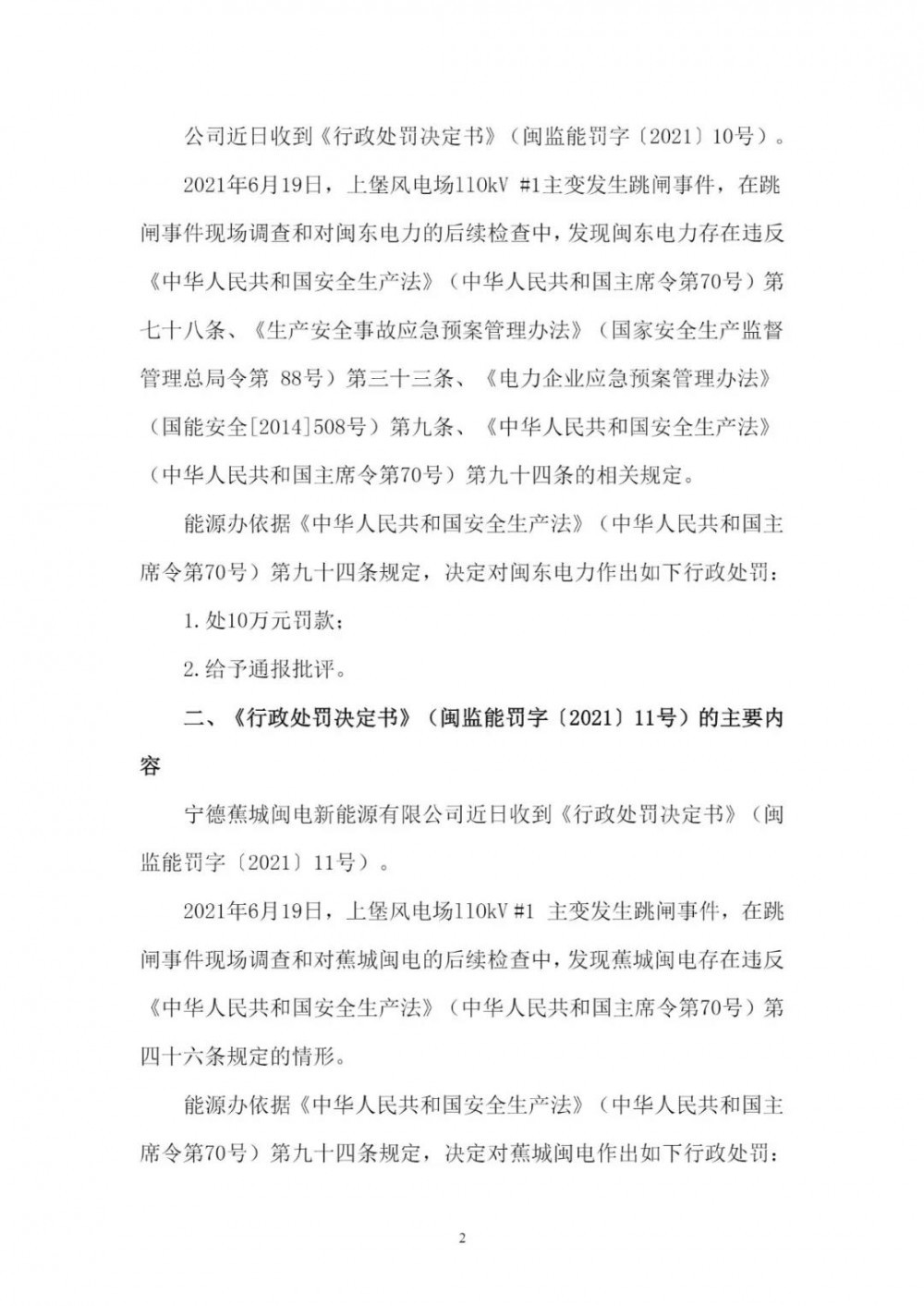 《公告》顯示,2021年6月19日,因上堡風(fēng)電場(chǎng)110kV#1主變發(fā)生跳閘事件,在跳閘事件現(xiàn)場(chǎng)調(diào)查和對(duì)閩東電力的后續(xù)檢查中,發(fā)現(xiàn)閩東電力、蕉城閩電、環(huán)三億能均存在違反相關(guān)法律條文的情況,分別處以10萬元、5萬元、5萬元的罰款。