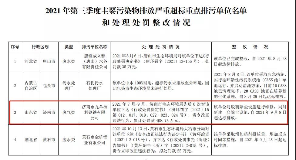 近日,生態(tài)環(huán)境部公布2021年第三季度主要污染物排放嚴重超標重點排污單位名單和處理處罰整改情況。其中,濟南市九羊福利鋼鐵有限公司因廢氣類污染等環(huán)境違法行為,累計處罰款408.75萬元。
