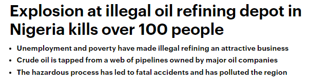 非法原油煉制產(chǎn)業(yè)有著致命后果,這些原油通常都是從大型石油業(yè)者們縱橫交錯的管線接取, 在簡陋儲槽煉制成油品. 程序復(fù)雜而危險, 已經(jīng)造成了許多致命意外事故,。