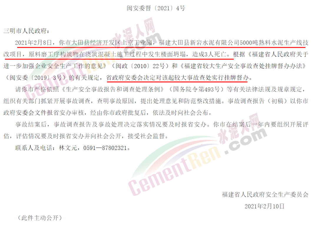 據(jù)水泥人網(wǎng)了解,福建省應急管理廳發(fā)布較大生產安全事故查處掛牌督辦通知書(三明大田2.8水泥技改項目施工過程樓面坍塌事故)稱,2021年2月8日,三明市大田縣經(jīng)濟開發(fā)區(qū)上京工業(yè)園,福建大田縣新巖水泥有限公司5000噸熟料水泥生產線技改項目,原料磨工序構筑物在澆筑混凝土施工過程中發(fā)生樓面坍塌,造成3人死亡。 依據(jù)有關規(guī)定,福建省政府安委會決定對該起較大事故查處實行掛牌督辦。