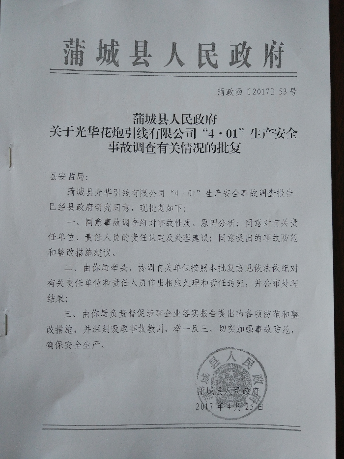 3、對本起事故監(jiān)管責任單位蒲城縣煙花爆竹執(zhí)法大隊,安全監(jiān)管實效差,建議蒲城縣煙花爆竹執(zhí)法大隊向縣政府寫出書面檢查。