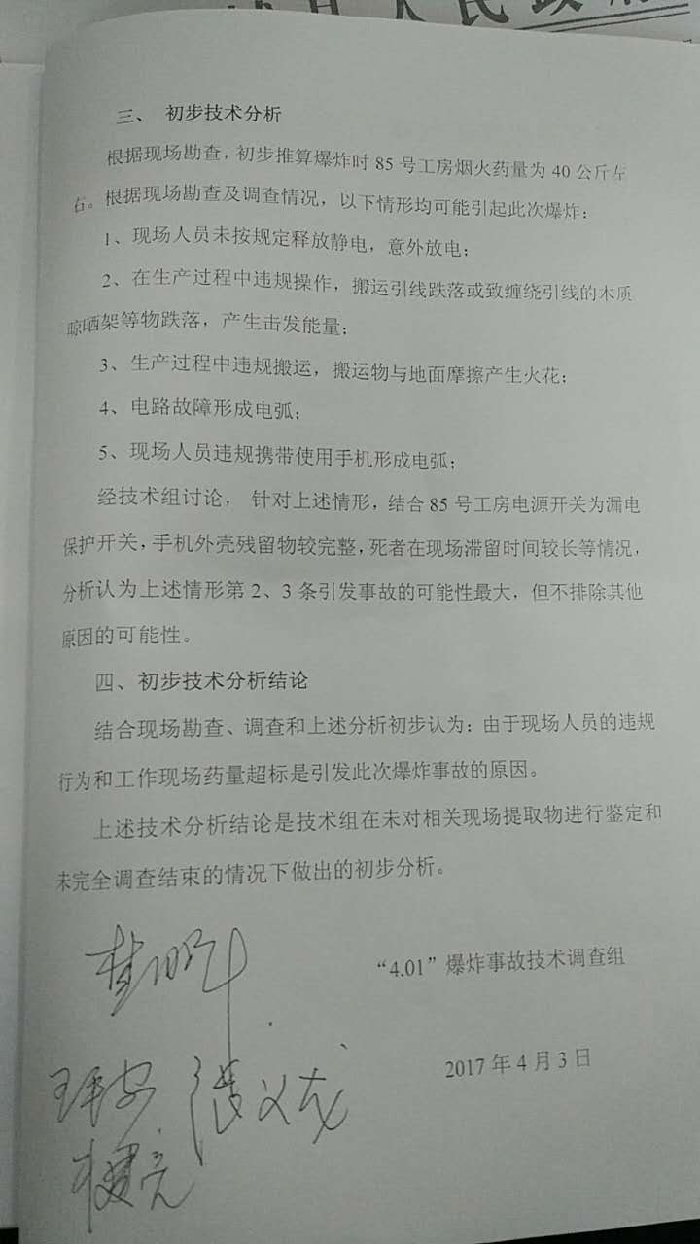 2017年4月1日晚20時40分左右,蒲城縣光華花炮引線有限公司發(fā)生一起燃燒爆炸傷亡事故,造成一人死亡,直接經濟損失80萬元左右。依據(jù)《安全生產法》、《生產安全事故報告和調查處理條例》等有關法律法規(guī)的規(guī)定,縣政府成立了蒲城縣光華花炮引線有限公司“4·01”燃燒爆炸傷亡生產安全事故調查組開展事故調查,并邀請縣人民檢察院派員參加,同時還聘請相關花炮專家參與調查。調查組通過現(xiàn)場勘查、調查取證、專家論證和綜合分析,查明了事故發(fā)生的經過、原因、人員傷亡和直接經濟損失等情況,認定了事故的性質和責任,提出了事故防范及整頓措施的建議,現(xiàn)將事故調查報告如下:
