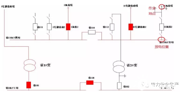 事發(fā)項目為某公司110千伏某變電站110千伏配電裝置改造,改造內(nèi)容為更換110千伏室內(nèi)敞開式手車斷路器,施工中標(biāo)單位為某集團有限公司電力安裝分公司(省管產(chǎn)業(yè)單位,簡稱“安裝分公司”)。為不影響重要用戶供電,改造期間變電站采用Ⅰ紅旗省府線直接串帶省1#變、Ⅱ鳳省線直接串帶省2#變的過渡方式運行。6月12日改造完成后,110千伏母線恢復(fù)運行。(運行方式見圖1、圖2)