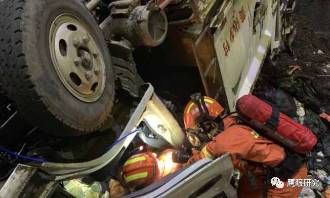 首批消防救援人員趕到現(xiàn)場了解得知,垃圾庫長 48 米、寬 20 米,總深度為 23 米,車輛從卸料平臺跌落至 12 米處的垃圾斜坡地段,呈車頂朝下、車底盤朝上倒翻狀態(tài),而且處于在垃圾坡度為 40 度左右的大斜坡上,隨時有更一步往下翻車至浸水區(qū)的危險?,F(xiàn)場指揮員通過前期勘查,咨詢現(xiàn)場工作人員垃圾廢料區(qū)有無致命氣體危險等相關(guān)情況后,迅速命令 4 名救援人員佩戴空氣呼吸器,攜帶破拆工具、有毒氣體探測儀、多功能救援擔(dān)架等救援設(shè)備利用軟梯、繩索下到事故救援點。由于車輛嚴(yán)重變形,導(dǎo)致救援操作困難被困者一時無法移出。