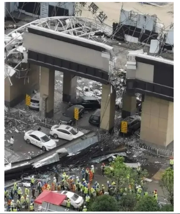 市民拍攝的多段視頻顯示,一輛黑色小轎車被倒塌的鋼筋壓住,后座一名年輕女子雙腿被壓受困,旁邊有人安撫她,等消防過來施救。另外還有一名男子受傷,坐在路面上,左手撐著身體,面部表情痛苦。