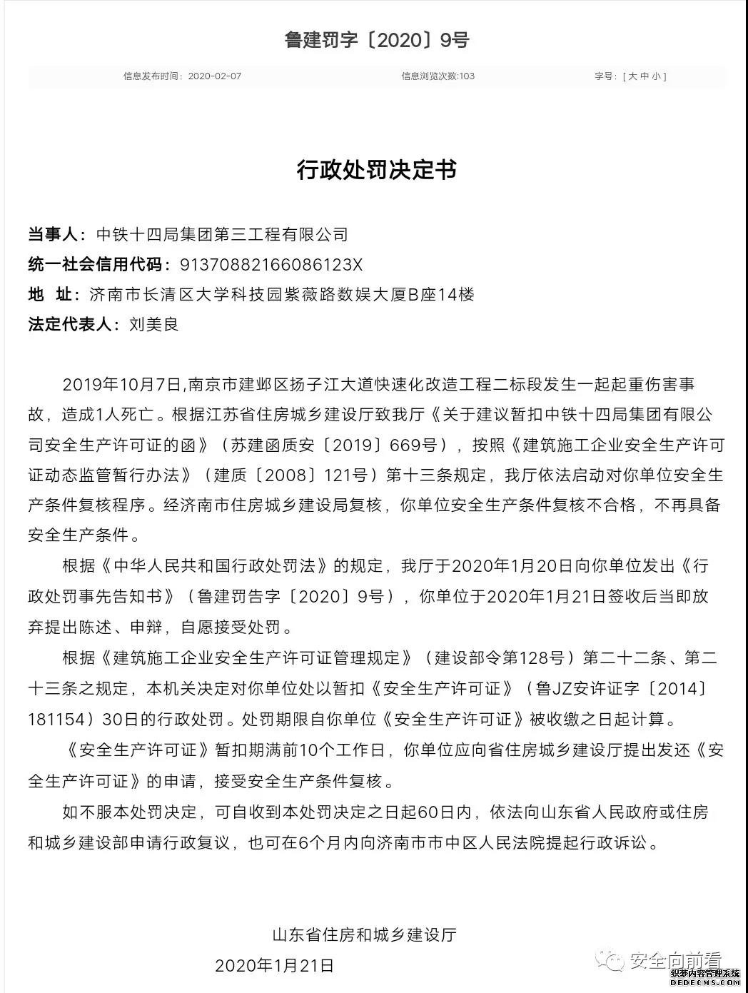 省住房城鄉(xiāng)建設(shè)廳魯建罰字〔2020〕9號(hào)行政處罰決定書顯示,2019年10月7日,南京市建鄴區(qū)揚(yáng)子江大道快速化改造工程二標(biāo)段發(fā)生一起起重傷害事故,造成1人死亡。根據(jù)江蘇省住房城鄉(xiāng)建設(shè)廳致我廳《關(guān)于建議暫扣中鐵十四局集團(tuán)有限公司安全生產(chǎn)許可證的函》(蘇建函質(zhì)安〔2019〕669號(hào)),按照《建筑施工企業(yè)安全生產(chǎn)許可證動(dòng)態(tài)監(jiān)管暫行辦法》(建質(zhì)〔2008〕121號(hào))第十三條規(guī)定,我廳依法啟動(dòng)對(duì)中鐵十四局三公司安全生產(chǎn)條件復(fù)核程序。