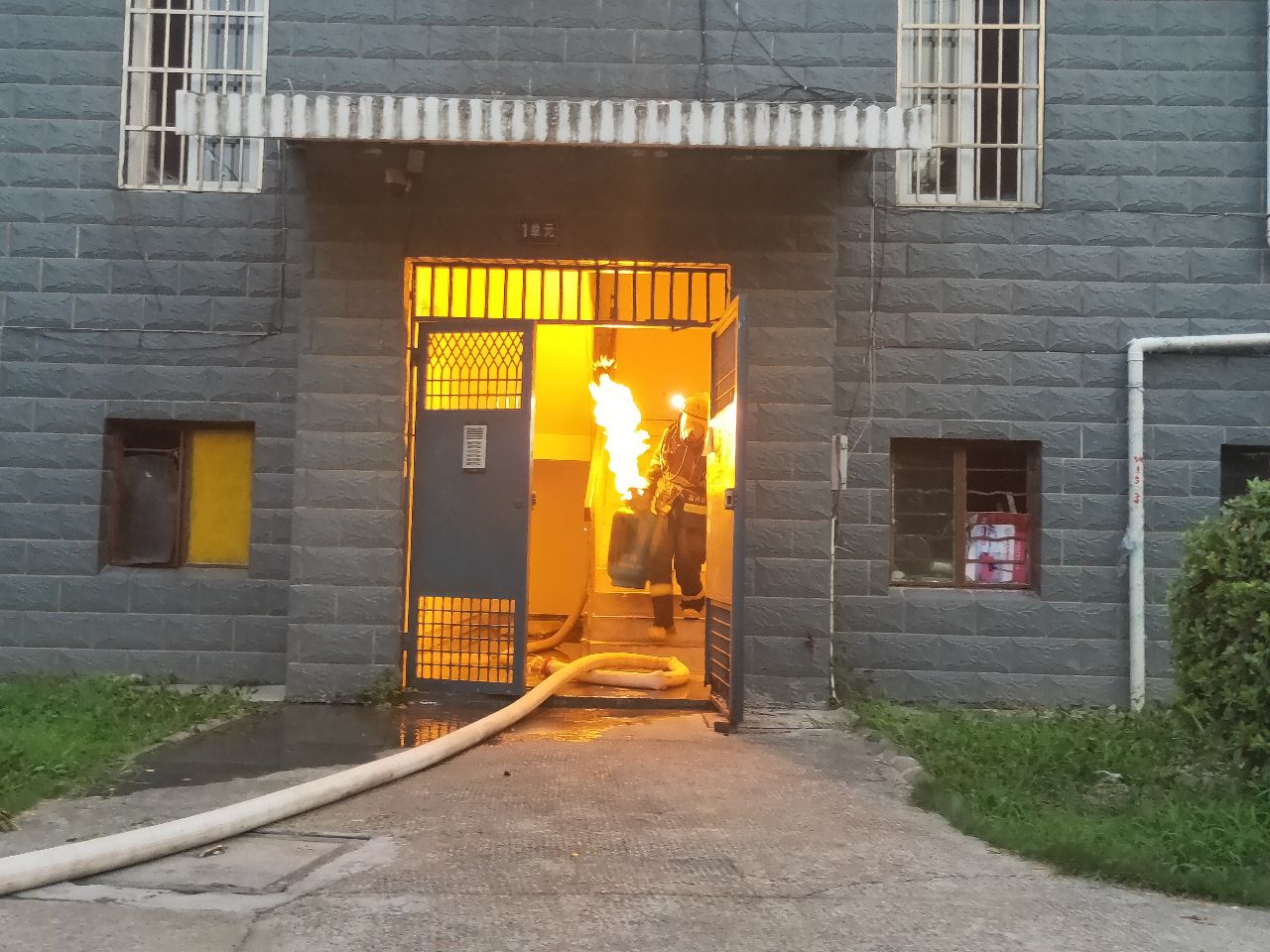 到達(dá)現(xiàn)場消防指戰(zhàn)員發(fā)現(xiàn),著火處物為煤氣罐,該煤氣罐位于居民房內(nèi)廚房里,處于猛烈燃燒階段,隨時(shí)都有爆炸的可能,而且居民樓樓下都住有居民,一旦發(fā)生爆炸,后果不堪設(shè)想。