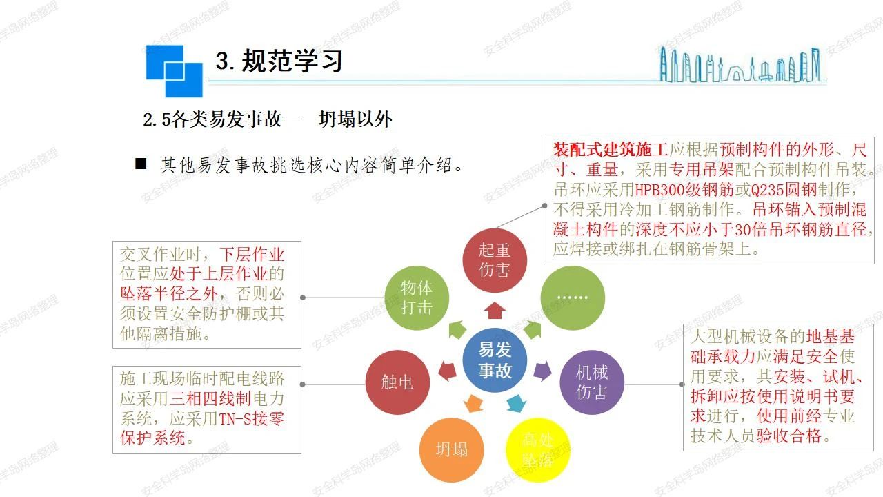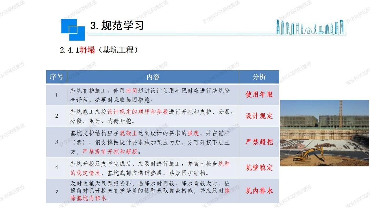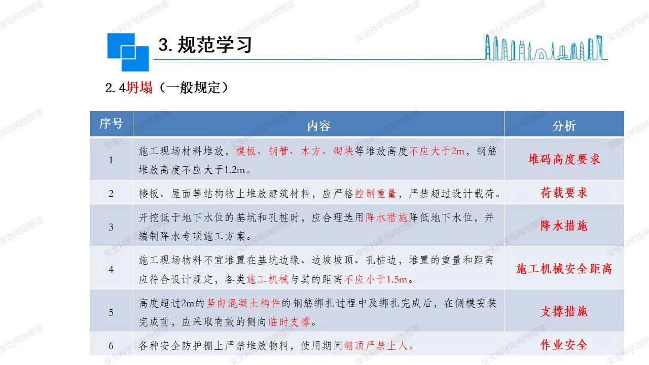 那么,坍塌事故發(fā)生的原因何在? (1)工程結(jié)構(gòu)設(shè)計(jì)不合理或計(jì)算失誤。 (2)施工前沒有編制切實(shí)可行的施工組織設(shè)計(jì)和專項(xiàng)施工方案,未做具體技術(shù)安全措施交底,特定施工項(xiàng)目未經(jīng)專家評(píng)審論證。 (3)腳手架、模板支撐、起重設(shè)備結(jié)構(gòu)設(shè)計(jì)不合理或計(jì)算失誤。 (4)建筑物結(jié)構(gòu)質(zhì)量低劣,安全性能差,地基不穩(wěn)定,不均勻沉降。 (5)建筑物結(jié)構(gòu)支撐連接(焊接)不牢固,超載、外力沖擊或嚴(yán)重偏心載荷造成失穩(wěn)等。 (6)腳手架及高大模板支架架體結(jié)構(gòu)不符合設(shè)計(jì)與規(guī)范要求,整體安全穩(wěn)定性差、超載或嚴(yán)重偏心荷載,遇外力沖擊或振動(dòng),不按程序拆除架體等因素造成失穩(wěn)等。 (7)基坑、土石方挖土?xí)r土壁不按規(guī)定留設(shè)邊坡(甚至負(fù)坡度),缺乏支護(hù)或支護(hù)不良,土質(zhì)不良或出現(xiàn)地下水、地表水的滲透,土壁經(jīng)不起重載側(cè)壓力或遇外力振動(dòng)、沖擊等因素造成土壁失穩(wěn)滑坡坍塌。 (8)起重設(shè)備技術(shù)安全性能差,結(jié)構(gòu)強(qiáng)度不夠,安全防護(hù)裝置不完善,垂直起重機(jī)與建筑物拉結(jié)差,出現(xiàn)超載、碰撞、升降過度或違章操作等原因,造成起重設(shè)備倒塌。 (9)現(xiàn)場(chǎng)作業(yè)環(huán)境不良,安全防護(hù)設(shè)施缺乏。 (10)施工現(xiàn)場(chǎng)管理松弛,各項(xiàng)質(zhì)量、安全管理制度流于形式。 (11)片面追求經(jīng)濟(jì)利益,偷工減料,施工質(zhì)量差。 (12)施工隊(duì)伍素質(zhì)差,不執(zhí)行法規(guī)、標(biāo)準(zhǔn),違章指揮、違章作業(yè),思想上存在盲目性、冒險(xiǎn)性、隨意性。 如何預(yù)防坍塌事故? (1)根據(jù)設(shè)計(jì)與規(guī)范要求,認(rèn)真編制施工組織設(shè)計(jì)和專項(xiàng)施工技術(shù)方案、應(yīng)急預(yù)案,做好特定施工項(xiàng)目專家評(píng)審論證及技術(shù)安全交底工作。 (2)支架、腳手架等搭設(shè)完成后應(yīng)組織相關(guān)部門驗(yàn)收。支架還應(yīng)按方案要求進(jìn)行堆載預(yù)壓。 (3)嚴(yán)格控制模板支架、腳手架等承受的荷載,模板、腳手架及其支撐體系的施工荷載應(yīng)做到均勻分布,并不得超過設(shè)計(jì)要求。嚴(yán)禁超載、對(duì)構(gòu)筑物進(jìn)行外力沖擊或偏心載荷。 (4)基坑、土石方挖土?xí)r土壁按規(guī)定留設(shè)邊坡,嚴(yán)格按照設(shè)計(jì)坡度進(jìn)行放坡開挖,進(jìn)行有效支護(hù)和排水,并設(shè)置專人對(duì)邊坡穩(wěn)定性進(jìn)行檢測(cè)?;討?yīng)基坑頂邊緣1m范圍內(nèi)禁止堆放材料。 (5)加強(qiáng)起重設(shè)備的采購(gòu)管理,嚴(yán)禁使用不合格的起重設(shè)備,并定期進(jìn)行檢測(cè),確保各項(xiàng)性能和安全防護(hù)裝置良好;加強(qiáng)起重設(shè)備的安裝、拆除管理;加強(qiáng)起重設(shè)備的使用管理,嚴(yán)禁超載、碰撞或違章操作;加強(qiáng)對(duì)起重設(shè)備操作人員、指揮人員、安拆人員的安全教育培訓(xùn),考核合格后持證上崗。 (6)加強(qiáng)施工現(xiàn)場(chǎng)管理,設(shè)置有效安全防護(hù)設(shè)施。 (7)加強(qiáng)對(duì)從業(yè)人員的培訓(xùn)教育,提高隊(duì)伍素質(zhì),強(qiáng)化質(zhì)量、安全意識(shí)。 (8)強(qiáng)化工程質(zhì)量報(bào)驗(yàn)和檢驗(yàn)、簽證制度,不經(jīng)檢驗(yàn)合格,不準(zhǔn)進(jìn)行下道工序施工。 (9)發(fā)現(xiàn)坍塌事故的險(xiǎn)情,要認(rèn)真分析原因,積極研究提出排除隱患的整改措施,并監(jiān)督執(zhí)行。
