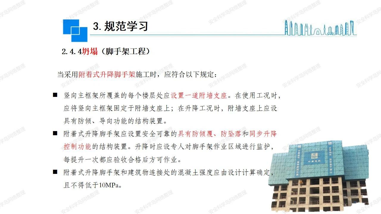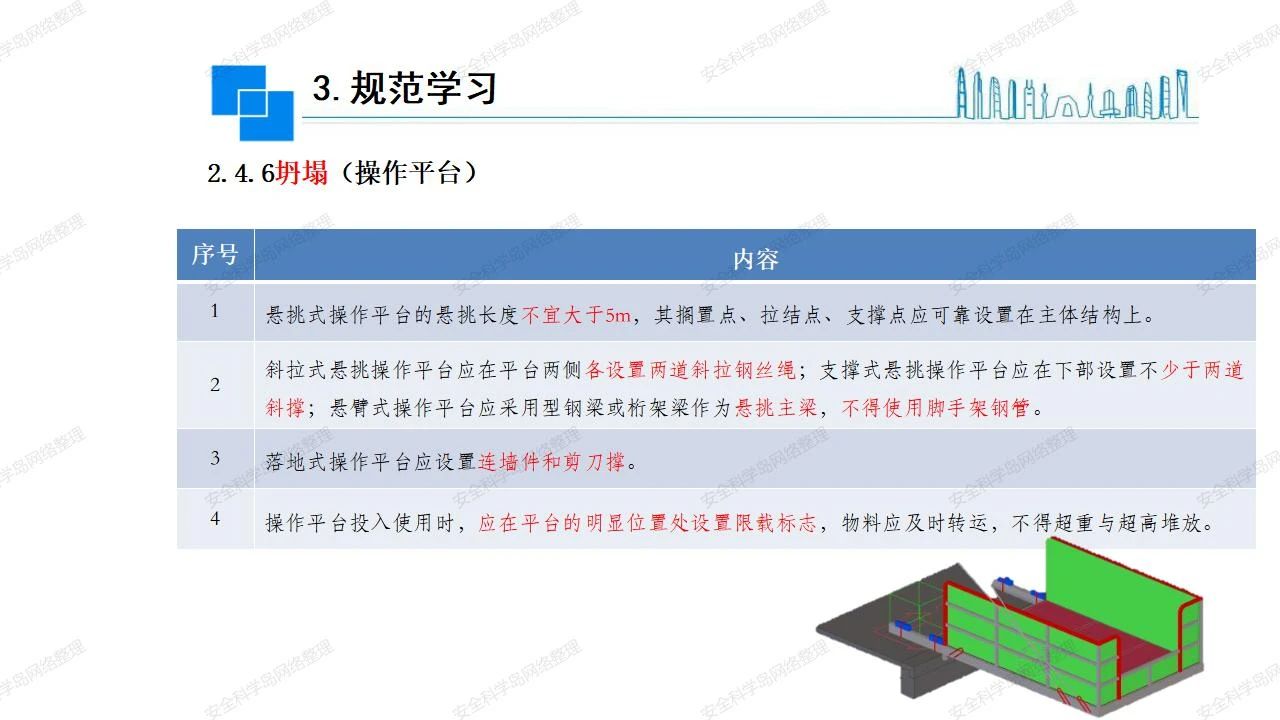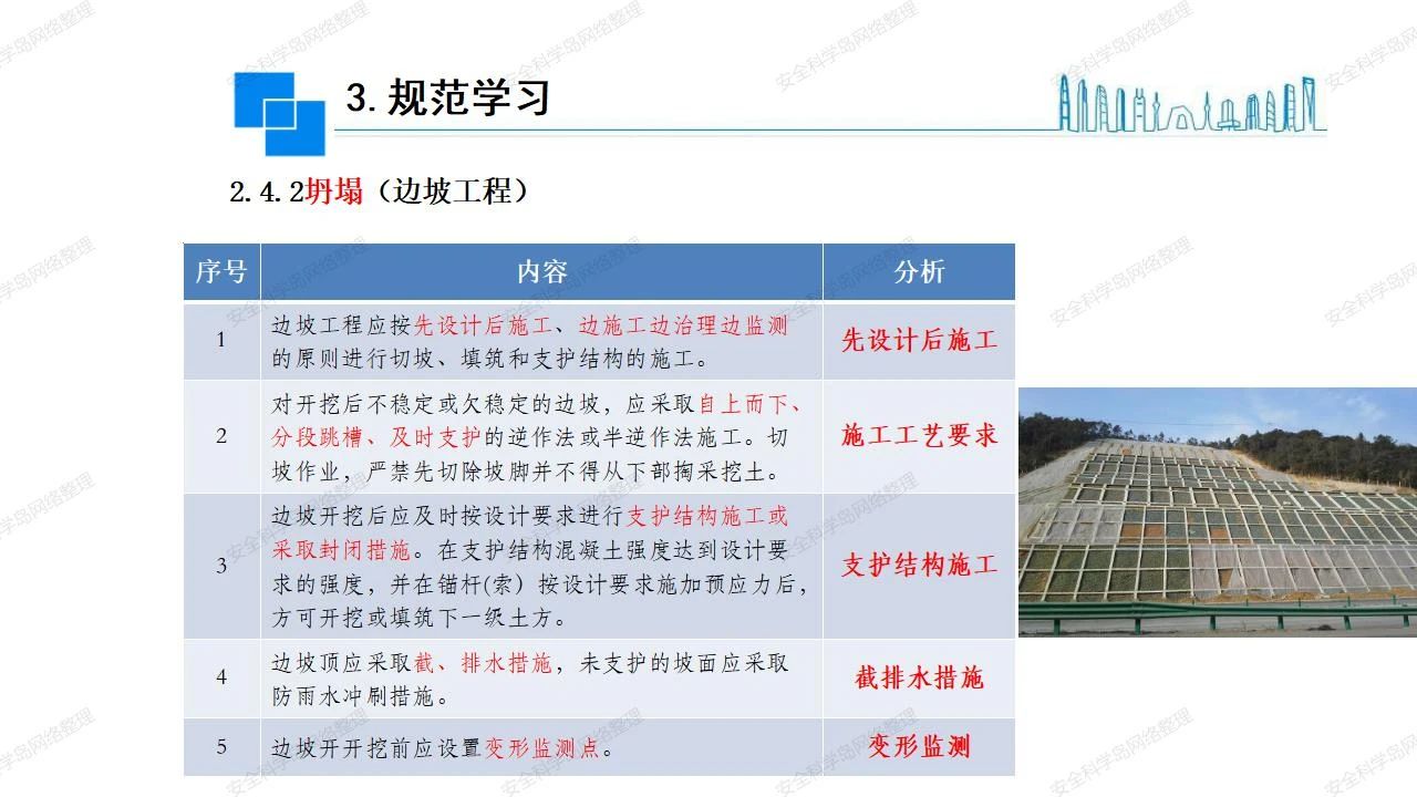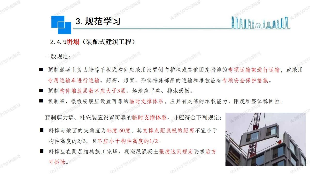那么,坍塌事故發(fā)生的原因何在? (1)工程結(jié)構(gòu)設(shè)計(jì)不合理或計(jì)算失誤。 (2)施工前沒有編制切實(shí)可行的施工組織設(shè)計(jì)和專項(xiàng)施工方案,未做具體技術(shù)安全措施交底,特定施工項(xiàng)目未經(jīng)專家評(píng)審論證。 (3)腳手架、模板支撐、起重設(shè)備結(jié)構(gòu)設(shè)計(jì)不合理或計(jì)算失誤。 (4)建筑物結(jié)構(gòu)質(zhì)量低劣,安全性能差,地基不穩(wěn)定,不均勻沉降。 (5)建筑物結(jié)構(gòu)支撐連接(焊接)不牢固,超載、外力沖擊或嚴(yán)重偏心載荷造成失穩(wěn)等。 (6)腳手架及高大模板支架架體結(jié)構(gòu)不符合設(shè)計(jì)與規(guī)范要求,整體安全穩(wěn)定性差、超載或嚴(yán)重偏心荷載,遇外力沖擊或振動(dòng),不按程序拆除架體等因素造成失穩(wěn)等。 (7)基坑、土石方挖土?xí)r土壁不按規(guī)定留設(shè)邊坡(甚至負(fù)坡度),缺乏支護(hù)或支護(hù)不良,土質(zhì)不良或出現(xiàn)地下水、地表水的滲透,土壁經(jīng)不起重載側(cè)壓力或遇外力振動(dòng)、沖擊等因素造成土壁失穩(wěn)滑坡坍塌。 (8)起重設(shè)備技術(shù)安全性能差,結(jié)構(gòu)強(qiáng)度不夠,安全防護(hù)裝置不完善,垂直起重機(jī)與建筑物拉結(jié)差,出現(xiàn)超載、碰撞、升降過度或違章操作等原因,造成起重設(shè)備倒塌。 (9)現(xiàn)場(chǎng)作業(yè)環(huán)境不良,安全防護(hù)設(shè)施缺乏。 (10)施工現(xiàn)場(chǎng)管理松弛,各項(xiàng)質(zhì)量、安全管理制度流于形式。 (11)片面追求經(jīng)濟(jì)利益,偷工減料,施工質(zhì)量差。 (12)施工隊(duì)伍素質(zhì)差,不執(zhí)行法規(guī)、標(biāo)準(zhǔn),違章指揮、違章作業(yè),思想上存在盲目性、冒險(xiǎn)性、隨意性。 如何預(yù)防坍塌事故? (1)根據(jù)設(shè)計(jì)與規(guī)范要求,認(rèn)真編制施工組織設(shè)計(jì)和專項(xiàng)施工技術(shù)方案、應(yīng)急預(yù)案,做好特定施工項(xiàng)目專家評(píng)審論證及技術(shù)安全交底工作。 (2)支架、腳手架等搭設(shè)完成后應(yīng)組織相關(guān)部門驗(yàn)收。支架還應(yīng)按方案要求進(jìn)行堆載預(yù)壓。 (3)嚴(yán)格控制模板支架、腳手架等承受的荷載,模板、腳手架及其支撐體系的施工荷載應(yīng)做到均勻分布,并不得超過設(shè)計(jì)要求。嚴(yán)禁超載、對(duì)構(gòu)筑物進(jìn)行外力沖擊或偏心載荷。 (4)基坑、土石方挖土?xí)r土壁按規(guī)定留設(shè)邊坡,嚴(yán)格按照設(shè)計(jì)坡度進(jìn)行放坡開挖,進(jìn)行有效支護(hù)和排水,并設(shè)置專人對(duì)邊坡穩(wěn)定性進(jìn)行檢測(cè)?;討?yīng)基坑頂邊緣1m范圍內(nèi)禁止堆放材料。 (5)加強(qiáng)起重設(shè)備的采購(gòu)管理,嚴(yán)禁使用不合格的起重設(shè)備,并定期進(jìn)行檢測(cè),確保各項(xiàng)性能和安全防護(hù)裝置良好;加強(qiáng)起重設(shè)備的安裝、拆除管理;加強(qiáng)起重設(shè)備的使用管理,嚴(yán)禁超載、碰撞或違章操作;加強(qiáng)對(duì)起重設(shè)備操作人員、指揮人員、安拆人員的安全教育培訓(xùn),考核合格后持證上崗。 (6)加強(qiáng)施工現(xiàn)場(chǎng)管理,設(shè)置有效安全防護(hù)設(shè)施。 (7)加強(qiáng)對(duì)從業(yè)人員的培訓(xùn)教育,提高隊(duì)伍素質(zhì),強(qiáng)化質(zhì)量、安全意識(shí)。 (8)強(qiáng)化工程質(zhì)量報(bào)驗(yàn)和檢驗(yàn)、簽證制度,不經(jīng)檢驗(yàn)合格,不準(zhǔn)進(jìn)行下道工序施工。 (9)發(fā)現(xiàn)坍塌事故的險(xiǎn)情,要認(rèn)真分析原因,積極研究提出排除隱患的整改措施,并監(jiān)督執(zhí)行。