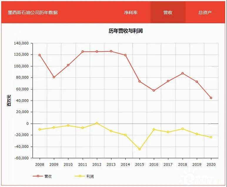 再看2008年至今的財報數(shù)據(jù),這一區(qū)間內(nèi)墨國油幾乎全部呈現(xiàn)虧損狀態(tài),2020年遭遇疫情嚴重沖擊,虧損額度更是高達230億美元。