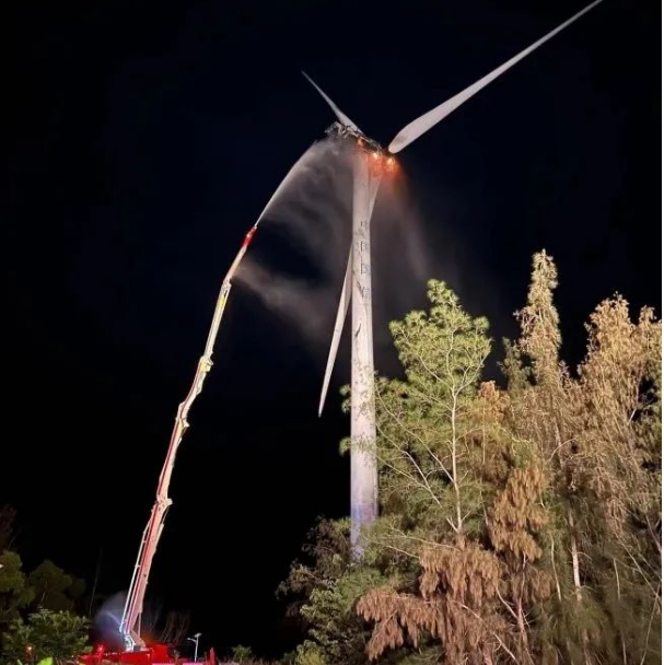 23時許,消防救援人員到達現(xiàn)場。經(jīng)偵查現(xiàn)場為海南東方高排風(fēng)力發(fā)電有限公司的17號風(fēng)機機艙著火,燃燒機艙墜落物導(dǎo)致地面樹林有多處雜草起火。了解現(xiàn)場情況后,指揮部立即做出戰(zhàn)斗部署:一是設(shè)立警戒立即疏散周邊圍觀人員防止高空墜落物傷人,并設(shè)置現(xiàn)場安全員,觀察現(xiàn)場救援環(huán)境;二是利用城市主戰(zhàn)車出槍撲救地面雜草火;三是利用62米舉高噴射車撲救發(fā)電機艙明火。