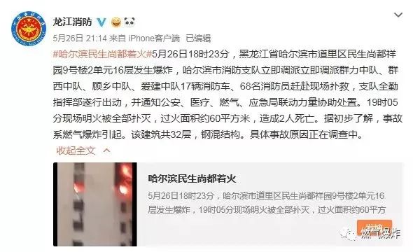 據(jù)@龍江消防:#哈爾濱民生尚都著火#5月26日18時(shí)23分,黑龍江省哈爾濱市道里區(qū)民生尚都祥園9號(hào)樓2單元16層發(fā)生爆炸,哈爾濱市消防支隊(duì)立即調(diào)派立即調(diào)派群力中隊(duì)、群西中隊(duì)、顧?quán)l(xiāng)中隊(duì)、愛建中隊(duì)17輛消防車、68名消防員趕赴現(xiàn)場撲救,支隊(duì)全勤指揮部遂行出動(dòng),并通知公安、醫(yī)療、燃?xì)狻?yīng)急局聯(lián)動(dòng)力量協(xié)助處置。19時(shí)05分現(xiàn)場明火被全部撲滅,過火面積約60平方米,造成2人死亡。據(jù)初步了解,事故系燃?xì)獗ㄒ?。該建筑?2層,鋼混結(jié)構(gòu)。
