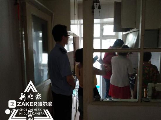 圖為事發(fā)現(xiàn)場 7 月 23 日 10 時 30 分許,斯大林派出所民警接到市民報警稱,在道里區(qū)尚志胡同 25 號 5 單元 4 樓的居民家中,有煤氣泄漏,十分危險,民警賈野等人立即出警。在現(xiàn)場,燃氣公司的工作人員說,煤氣泄漏已經(jīng)達到爆炸標準,需要立刻疏散居民。