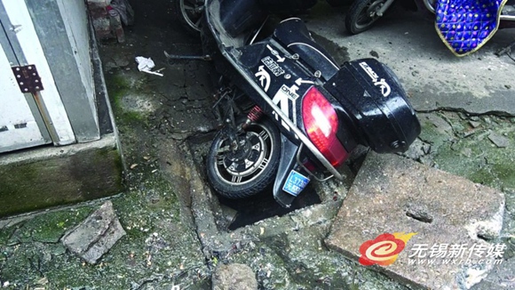 現(xiàn)場(chǎng)了解到,這次自行“跳躍”的窨井蓋數(shù)目不少,不過事故的動(dòng)靜不大,只有窨井蓋周圍有崩壞的痕跡,掉落下一些水泥塊,周圍并無燃燒跡象,也沒造成人員受傷。要說最“嚴(yán)重”的,則是其中一個(gè)窨井旁停放的電動(dòng)車,被彈起的窨井蓋撞倒(見圖)。