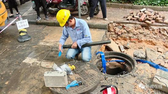 先不要敲,先不要敲,我們查一下濃度先,要不等一下(有)火花(發(fā)生)爆炸,這是雨水井啊,測一下濃度。這是雨水井,雨水井如果有氣進(jìn)去了同樣會爆炸,現(xiàn)在地下也是有,還是有是吧,等一下散了才能敲。