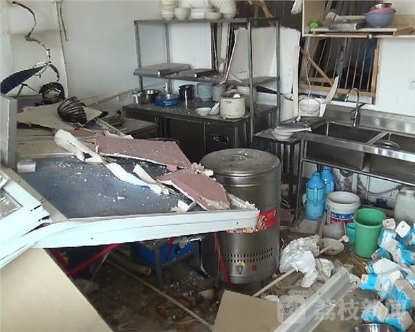 記者現(xiàn)場(chǎng)看到工人正在拆卸樓上被炸碎裂的玻璃窗戶,樓下全是窗戶玻璃碎片,爆炸的牛肉面館和隔壁的房東餃面飼料店里一片狼藉,隔壁移動(dòng)公司和一個(gè)煙酒店玻璃窗戶和門牌也被炸碎裂和損壞。記者進(jìn)入餃面店發(fā)現(xiàn),里面操作臺(tái)旁邊還有煤氣瓶,房頂砸脫落熏黑,房東房間窗戶也被炸彎曲變形,隔壁房東的店鋪里面也是狼藉一片,整袋的米和飼料包裝袋被砸損。大門也被砸壞。