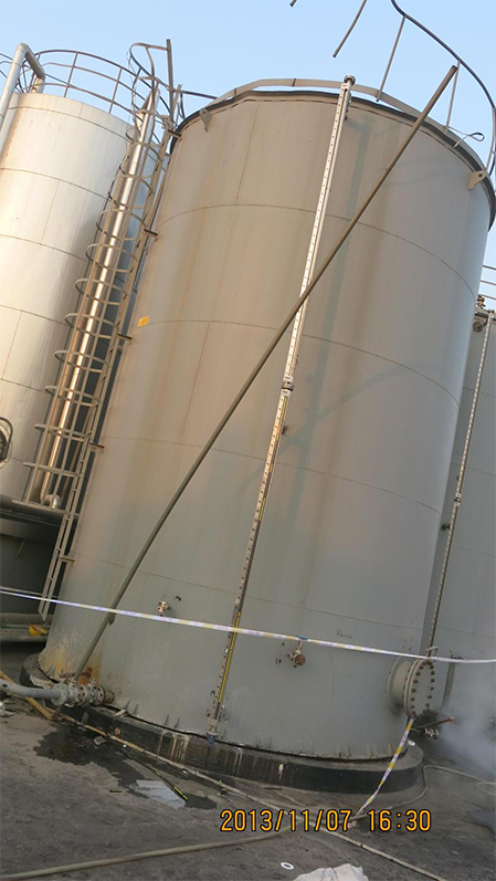 | 2013年10月份 | 九江天賜公司員工巡檢時(shí)就發(fā)現(xiàn)電解質(zhì)二期廢酸儲(chǔ)罐區(qū)A罐出現(xiàn)液位計(jì)穿孔等問題,采取了臨時(shí)措施堵漏。 | |