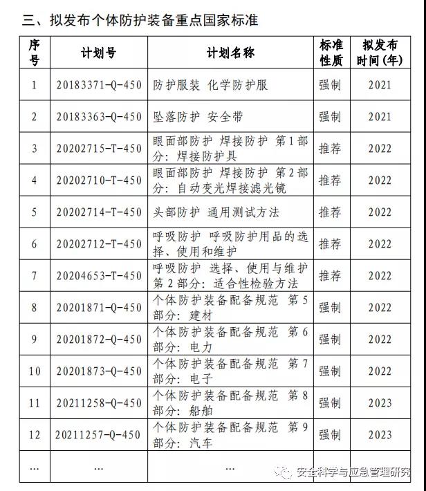 一、總體要求 深入學(xué)習(xí)貫徹習(xí)近平總書記“把人民群眾生命安全和身體健康放在第一位”的重要指示精神,落實(shí)《國(guó)家標(biāo)準(zhǔn)化發(fā)展綱要》,實(shí)施公共安全標(biāo)準(zhǔn)化筑底工程,堅(jiān)持人民至上、生命至上,聚焦重點(diǎn)行業(yè)、重點(diǎn)產(chǎn)品,加大標(biāo)準(zhǔn)研制工作進(jìn)度,充分發(fā)揮標(biāo)準(zhǔn)引領(lǐng)帶動(dòng)作用,推動(dòng)個(gè)體防護(hù)裝備質(zhì)量與安全水平持續(xù)提升,推動(dòng)生產(chǎn)經(jīng)營(yíng)單位嚴(yán)格按照國(guó)家標(biāo)準(zhǔn)要求配備個(gè)體防護(hù)裝備,為維護(hù)勞動(dòng)者安全健康權(quán)益提供更加有力支撐。 到2023年底,個(gè)體防護(hù)裝備標(biāo)準(zhǔn)體系進(jìn)一步完善,重點(diǎn)個(gè)體防護(hù)裝備產(chǎn)品標(biāo)準(zhǔn)水平持續(xù)提升,主要性能指標(biāo)與國(guó)際、國(guó)外發(fā)達(dá)國(guó)家保持基本一致,個(gè)體防護(hù)裝備國(guó)際標(biāo)準(zhǔn)取得重點(diǎn)突破。推出一批重點(diǎn)行業(yè)個(gè)體防護(hù)裝備配備標(biāo)準(zhǔn),配備標(biāo)準(zhǔn)對(duì)生產(chǎn)經(jīng)營(yíng)單位個(gè)體防護(hù)裝備的規(guī)范作用初步顯現(xiàn)。重點(diǎn)個(gè)體防護(hù)裝備質(zhì)量監(jiān)督抽查,重點(diǎn)行業(yè)、領(lǐng)域個(gè)體防護(hù)裝備配備的執(zhí)法檢查得到有效開(kāi)展,個(gè)體防護(hù)裝備標(biāo)準(zhǔn)管理、產(chǎn)品生產(chǎn)、檢驗(yàn)檢測(cè)、配備使用及實(shí)施反饋的閉環(huán)機(jī)制基本形成。個(gè)體防護(hù)裝備標(biāo)準(zhǔn)化助力行業(yè)高質(zhì)量發(fā)展,保障勞動(dòng)者生命安全和身體健康的作用進(jìn)一步凸顯。 二、重點(diǎn)任務(wù) (一)集中發(fā)布實(shí)施一批個(gè)體防護(hù)裝備國(guó)家標(biāo)準(zhǔn)。 加大個(gè)體防護(hù)裝備領(lǐng)域國(guó)家標(biāo)準(zhǔn)的有效供給,逐步建立健全個(gè)體防護(hù)裝備標(biāo)準(zhǔn)體系。在已有石化、冶金、有色、礦山等領(lǐng)域個(gè)體防護(hù)配備標(biāo)準(zhǔn)的基礎(chǔ)上再重點(diǎn)選取建材、電子、電力等急需短缺行業(yè)、領(lǐng)域,從個(gè)體防護(hù)裝備的配備原則、配備程序、配備基本要求、判廢和更換、培訓(xùn)和使用等方面,制定發(fā)布一批個(gè)體防護(hù)裝備配備強(qiáng)制性國(guó)家標(biāo)準(zhǔn),為高危行業(yè)從業(yè)人員的個(gè)體防護(hù)裝備配備管理提供執(zhí)法和監(jiān)管依據(jù)。對(duì)標(biāo)國(guó)際先進(jìn)標(biāo)準(zhǔn),集中推出一批個(gè)體防護(hù)裝備產(chǎn)品和檢測(cè)相關(guān)推薦性國(guó)家標(biāo)準(zhǔn),以標(biāo)準(zhǔn)引領(lǐng)我國(guó)個(gè)體防護(hù)相關(guān)產(chǎn)品質(zhì)量安全水平持續(xù)提升。在呼吸防護(hù)、防護(hù)服裝等領(lǐng)域,牽頭提出國(guó)際標(biāo)準(zhǔn)項(xiàng)目提案,推動(dòng)我國(guó)個(gè)體防護(hù)裝備國(guó)際標(biāo)準(zhǔn)取得新突破。 (二)深入開(kāi)展標(biāo)準(zhǔn)宣傳和培訓(xùn)。 采取集中宣貫為主,培訓(xùn)、調(diào)研為輔的形式,組織全國(guó)個(gè)體防護(hù)裝備標(biāo)準(zhǔn)化技術(shù)委員會(huì)等相關(guān)單位,面向生產(chǎn)企業(yè)、檢測(cè)機(jī)構(gòu)和生產(chǎn)經(jīng)營(yíng)單位進(jìn)行全方位、多層次、有針對(duì)性的宣貫培訓(xùn),按年度制定并發(fā)布標(biāo)準(zhǔn)宣貫計(jì)劃。引導(dǎo)廣大生產(chǎn)企業(yè)“學(xué)標(biāo)、用標(biāo)、對(duì)標(biāo)”,加快企業(yè)技術(shù)更新,推動(dòng)產(chǎn)品升級(jí)換代。開(kāi)展“個(gè)體防護(hù)裝備標(biāo)準(zhǔn)進(jìn)基層,筑牢最后一道防線”系列活動(dòng),推動(dòng)生產(chǎn)經(jīng)營(yíng)單位按需求購(gòu)買、按標(biāo)準(zhǔn)配備、按工種佩戴。 (三)強(qiáng)化個(gè)體防護(hù)裝備質(zhì)量安全監(jiān)管。 統(tǒng)籌做好生產(chǎn)和流通領(lǐng)域個(gè)體防護(hù)裝備的質(zhì)量監(jiān)督抽查,以問(wèn)題為導(dǎo)向,突出抽查重點(diǎn)產(chǎn)品和重點(diǎn)領(lǐng)域,繼續(xù)加大非醫(yī)用口罩等防護(hù)裝備,以及安全網(wǎng)、安全帽等與安全生產(chǎn)密切相關(guān)的防護(hù)裝備的監(jiān)督抽查力度。力爭(zhēng)用3年時(shí)間,清理一批違法違規(guī)生產(chǎn)銷售產(chǎn)品,查處一批違法大案要案,解決一批質(zhì)量安全突出問(wèn)題,全面提升個(gè)體防護(hù)裝備質(zhì)量水平。 (四)加強(qiáng)個(gè)體防護(hù)裝備產(chǎn)品的認(rèn)證認(rèn)可有效供給。 建立適合個(gè)體防護(hù)裝備及相關(guān)領(lǐng)域的質(zhì)量認(rèn)證制度體系,促進(jìn)新技術(shù)、新產(chǎn)品、新業(yè)態(tài)的成熟應(yīng)用。在個(gè)體防護(hù)裝備領(lǐng)域支持一批技術(shù)有特長(zhǎng)、服務(wù)有特色的專業(yè)檢驗(yàn)檢測(cè)認(rèn)證機(jī)構(gòu)發(fā)展,不斷滿足市場(chǎng)多樣化、個(gè)性化需求。加強(qiáng)能力驗(yàn)證制度在個(gè)體防護(hù)裝備檢測(cè)領(lǐng)域的應(yīng)用,幫助相關(guān)檢驗(yàn)檢測(cè)機(jī)構(gòu)提升技術(shù)能力和人員水平。對(duì)標(biāo)國(guó)際,促進(jìn)個(gè)體防護(hù)裝備產(chǎn)品領(lǐng)域合格評(píng)定結(jié)果